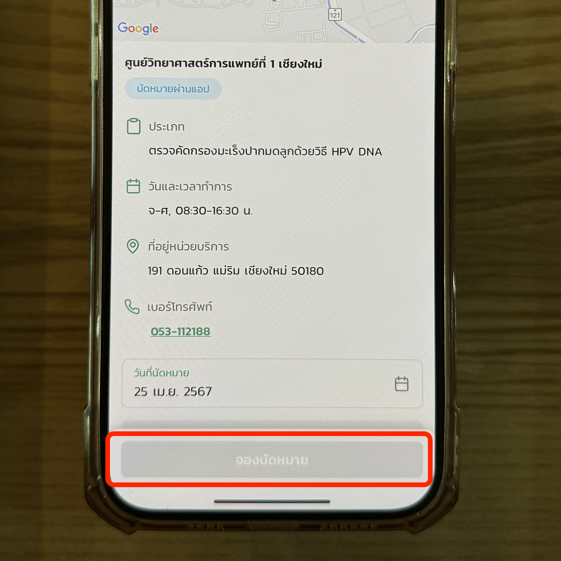 หากอยากนัดหมายเพื่อเข้าใช้บริการ ให้เลือกเมนูที่ต้องการ ในตัวอย่างจะเป็นการนัดหมายเพื่อตรวจมะเร็งปากมดลูกฟรี โดยที่เมนูนี้ จะมีข้อมูลบอกด้วยว่า เราสามารถตรวจได้กี่ครั้ง/ต่อกี่ปี