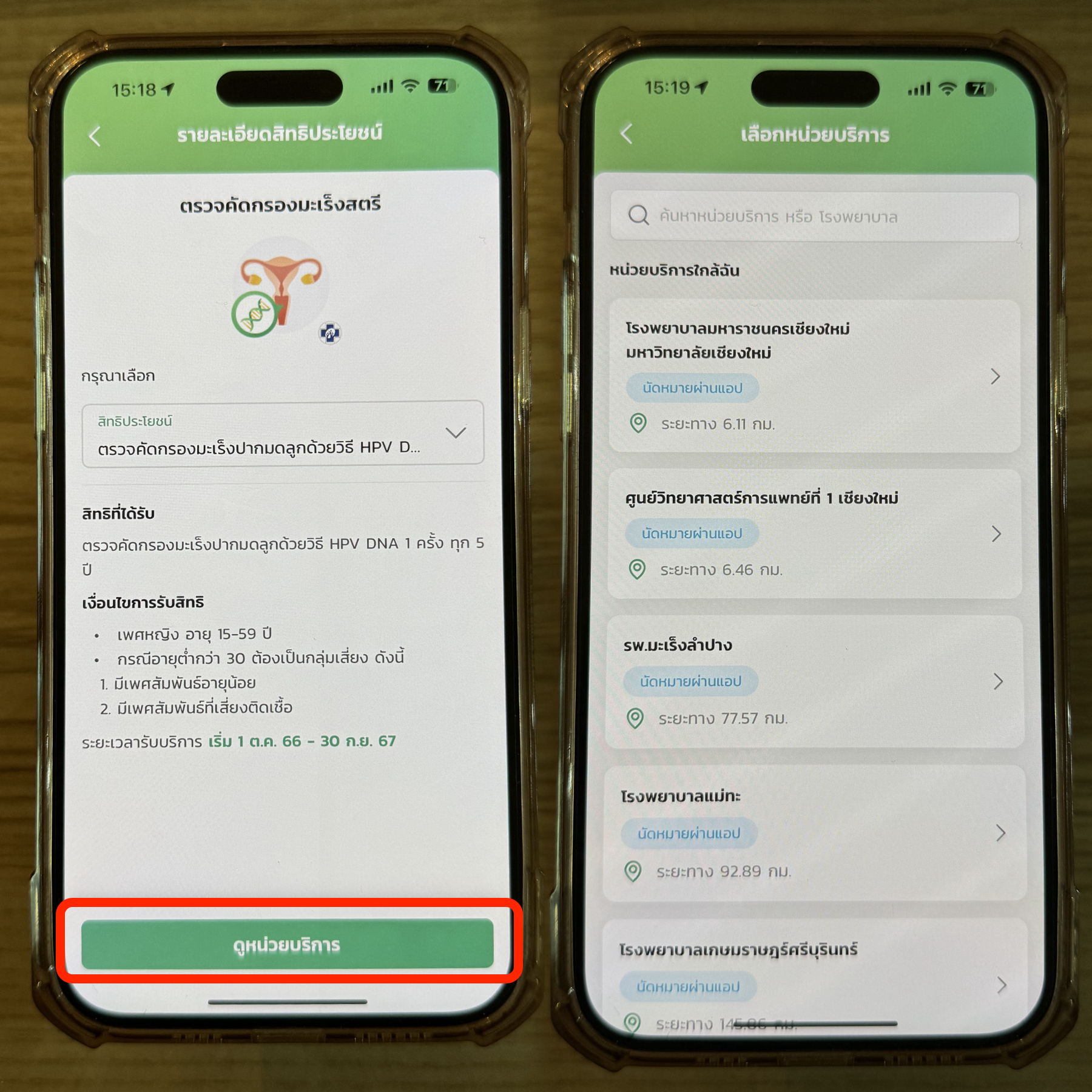 อย่าลืมดูระยะเวลารับบริการ และอ่านเกณฑ์การเข้ารับบริการให้ครบถ้วน เมื่อมีเกณฑ์ตรงกับที่ระบุ สามารถหาสถานบริการใกล้บ้านได้โดยกดที่ปุ่ม “ดูหน่วยบริการ” > เลือกหน่วยบริการที่สะดวก