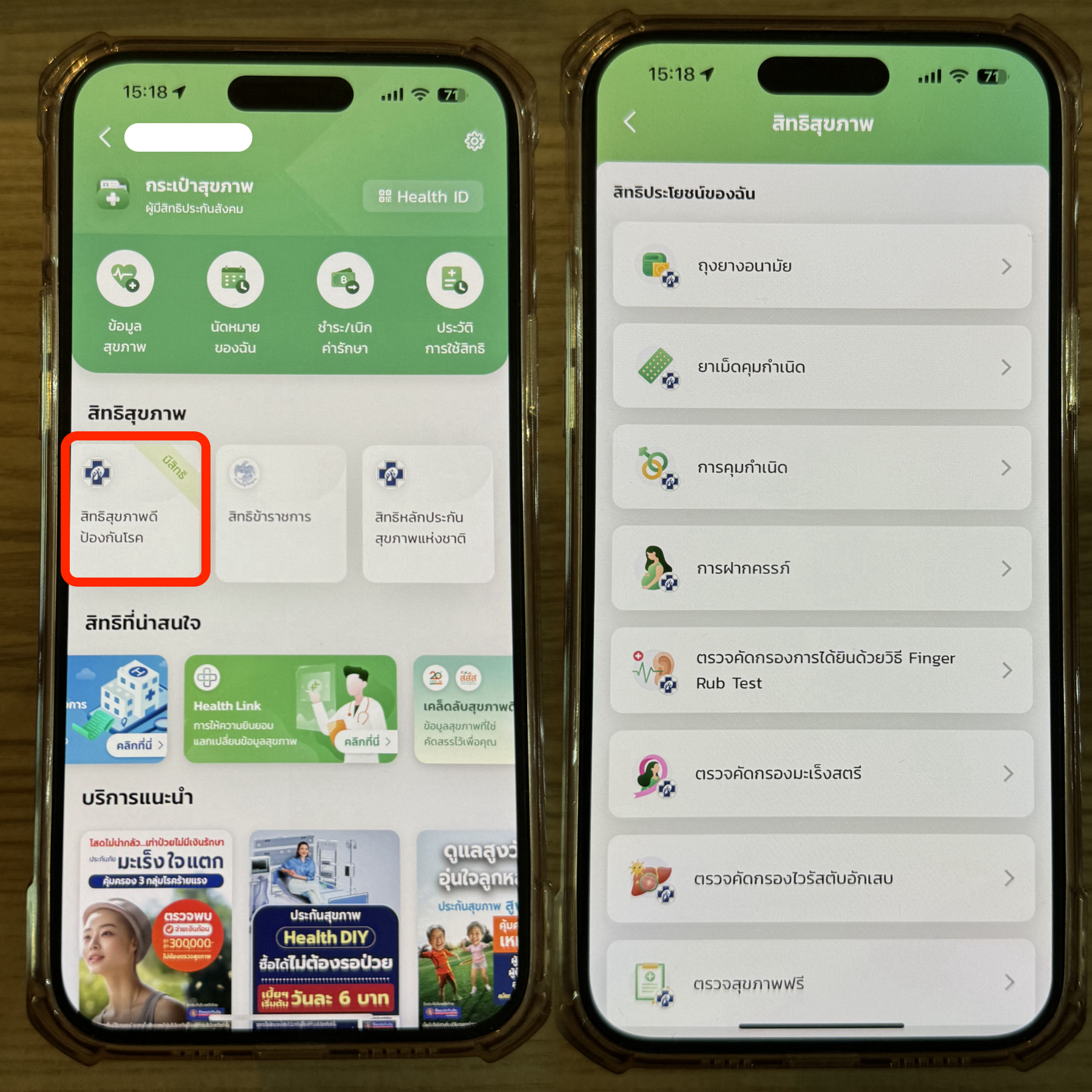 พอเข้ามาที่กระเป๋าสุขภาพแล้ว ให้สังเกตที่เมนู “สิทธิสุขภาพ” > เข้าไปที่ “สิทธิสุขภาพดีป้องกันโรค”