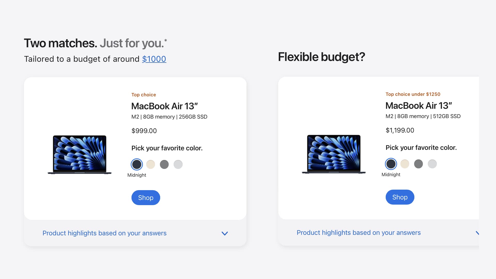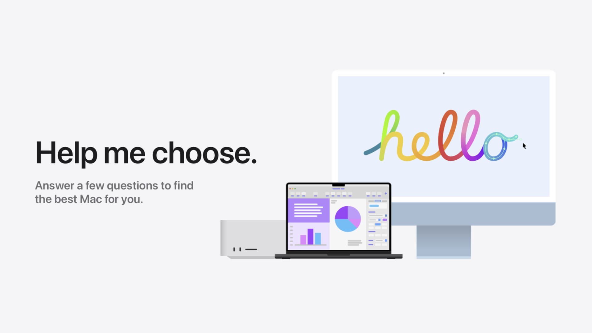 เว็บไซต์ “Help me choose.” เป็นตัวช่วยให้ผู้ใช้งานสามารถเลือกซื้อ Mac ที่ตรงใจและเหมาะสมกับความต้องการมากที่สุด โดยหน้าเว็บนี้จะมาในรูปแบบของคำถามง่าย ๆ ที่จะช่วยให้คุณค้นพบ Mac รุ่นที่ใช่สำหรับคุณ