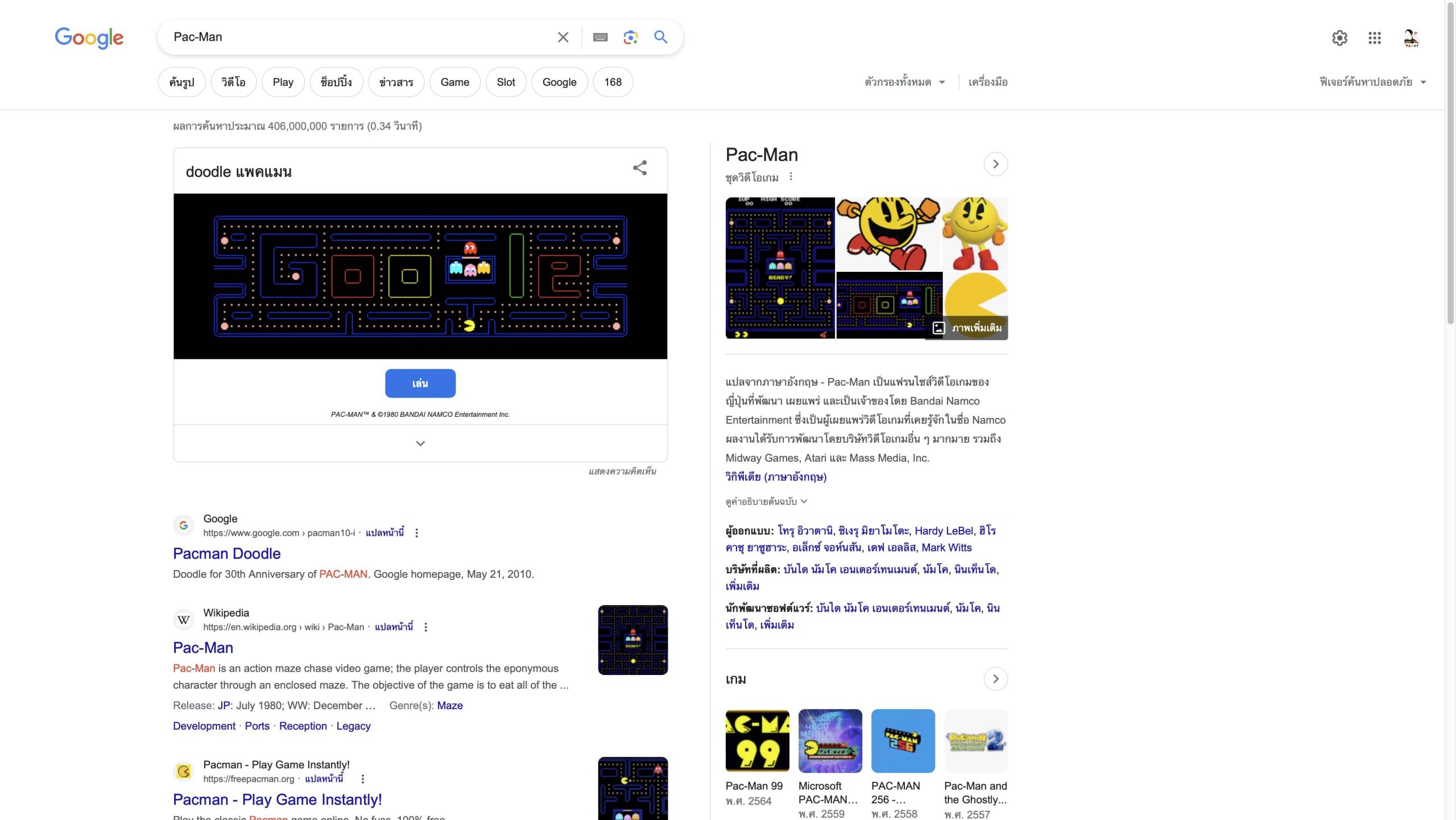 เพียงแค่ป้อนคำนี้ลงไป เราก็จะเล่นเกม Pac-Man ได้ง่าย ๆ บน Google แล้ว