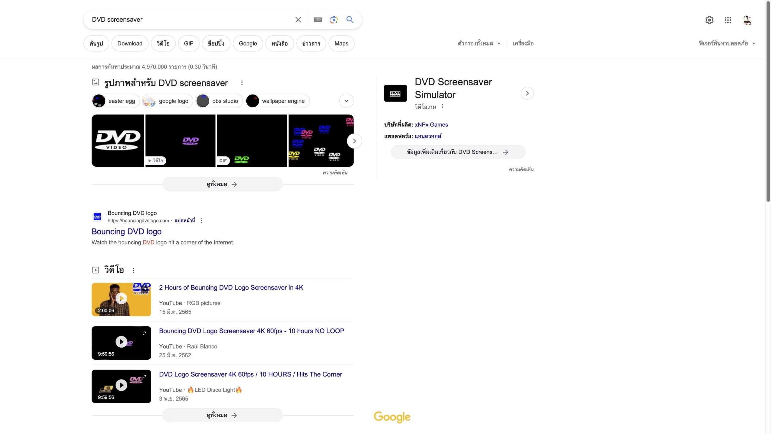 เพียงเราป้อนคำนี้ลงไป ตัวโลโก้ Google ก็จะเด้งลอยไปลอยมา เหมือนกับการรอเครื่องให้เราใส่เแผ่นเครื่องเล่น DVD ในสมัยก่อน