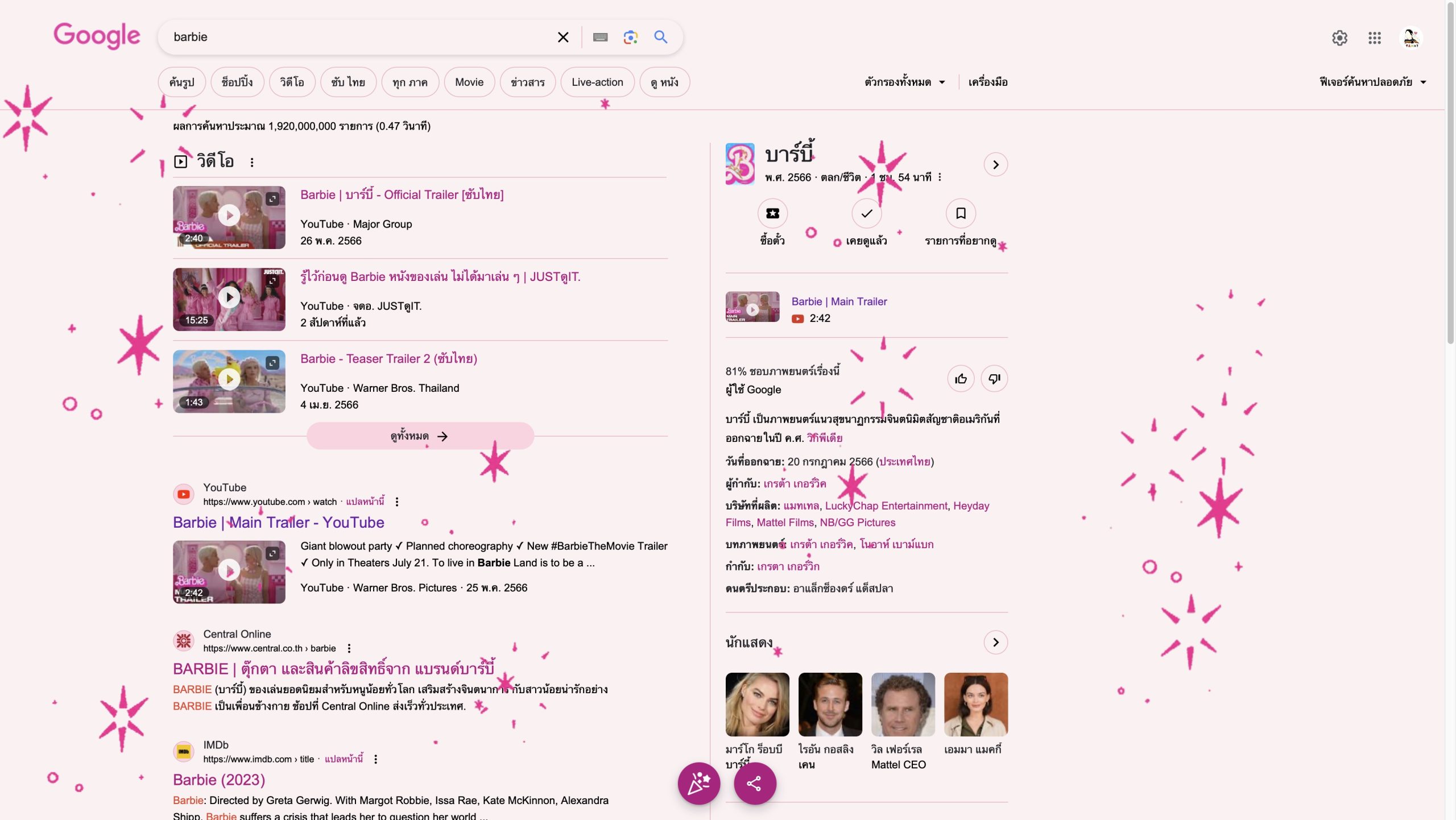 เพียงแค่ป้อนคำนี้จะมีพลุสีชมพูน่ารัก ๆ ขึ้นมา แถมยังทำให้เว็บของเราสีชมพูสุดหวานแหววด้วย