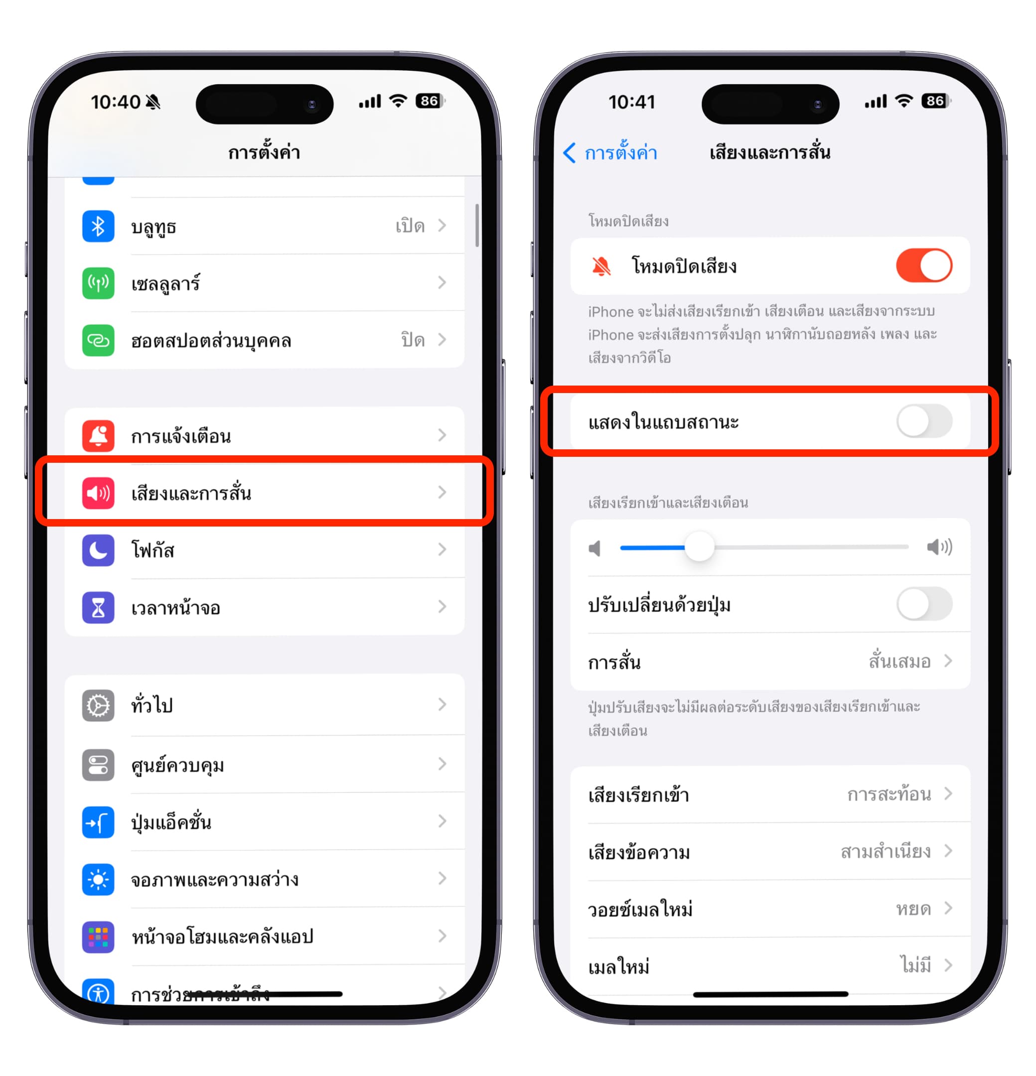 ไปที่แอปการตั้งค่า > เสียงและการสั่น > ปิด “แสดงในแถบสถานะ”
