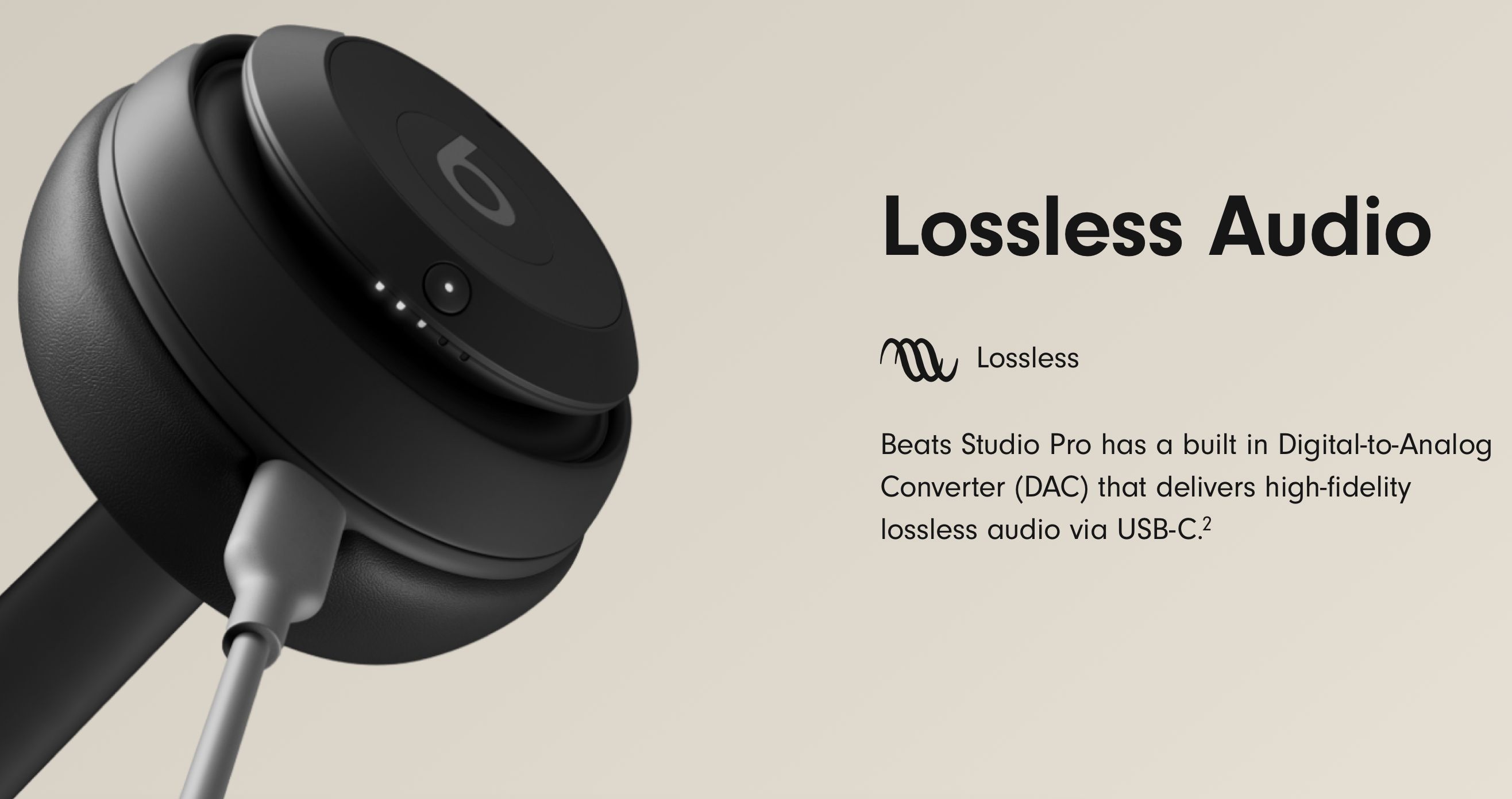 สามารถฟังเสียงแบบคุณภาพสูงเหมือนอยู่ในห้องอัดได้เพราะ Beats Studio Pro รองรับการฟังแบบ Lossless ด้วยที่สามารถเชื่อมต่อได้ผ่านพอร์ต USB-C รวมถึงมีช่องต่อสัญญาณเสียงแบบ 3.5 มม. มาให้ด้วย