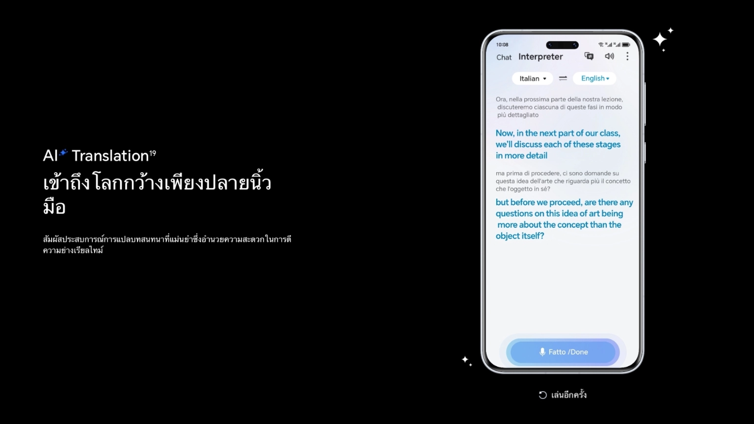AI Translation ที่รองรับการแปลทันทีสูงสุด 15 ภาษา ได้แก่ ไทย, อังกฤษ, ฝรั่งเศส, อิตาลี, เยอรมัน, สเปน, รัสเซีย, ตุรกี, จีน และอื่น ๆ โดยฟีเจอร์นี้รองรับทั้งโหมด Conversation สำหรับการสนทนาระหว่างสองคนที่นั่งติดกัน และโหมด Face-to-Face สำหรับการสนทนาระหว่างคนที่นั่งอยู่ด้านตรงข้ามกับอุปกรณ์