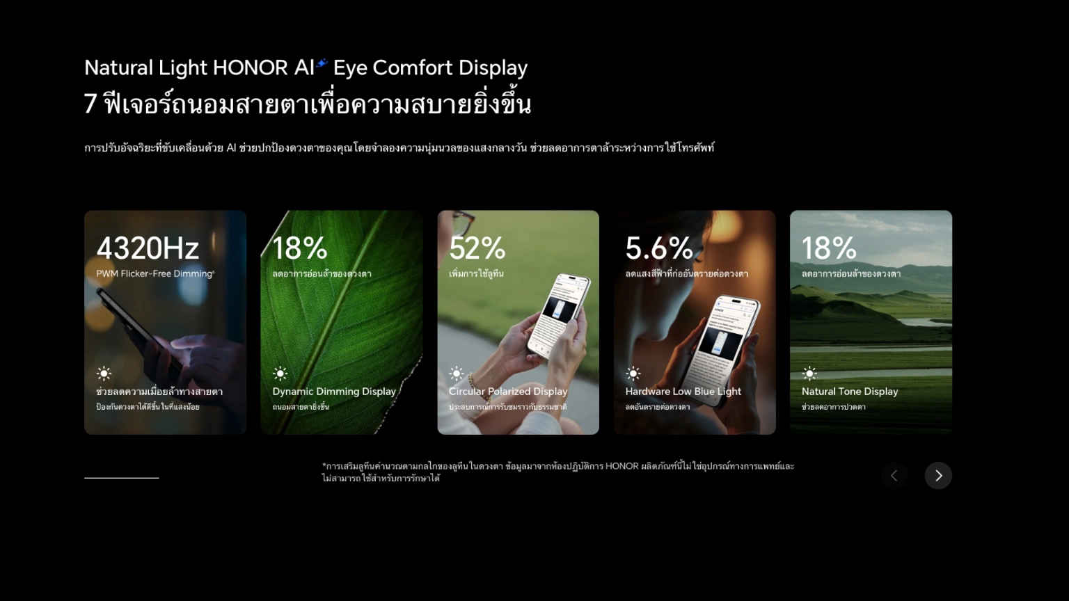 นอกจากนี้ เทคโนโลยี Circular Polarized Display ของจอ Nutural Light HONOR AI Eye Comfort ทำให้แสงหน้าจอนุ่มนวลขึ้นโดยการเปลี่ยนโพลาไรซ์จากเชิงเส้นเป็นวงกลม โดยจำลองแสงแดดธรรมชาติและให้แสงสม่ำเสมอจากทุกมุม พร้อมปรับปรุงการดูดซึมลูทีนถึง 52% ซึ่งช่วยลดความเมื่อยล้าของดวงตาได้ 16% ตลอดจนช่วยบล็อกแสงสีน้ำเงินที่เป็นอันตราย และเพิ่มความคมชัด ความไวของคอนทราสต์ รวมถึงการมองเห็นแสงจ้า ทำให้การใช้งานหน้าจอเป็นเวลานานสะดวกสบายและสนุกสนานยิ่งขึ้น
