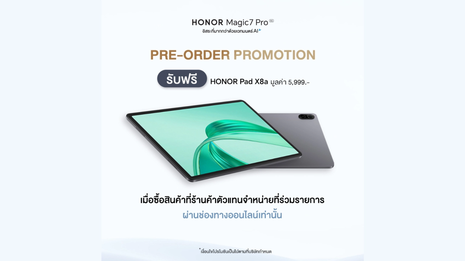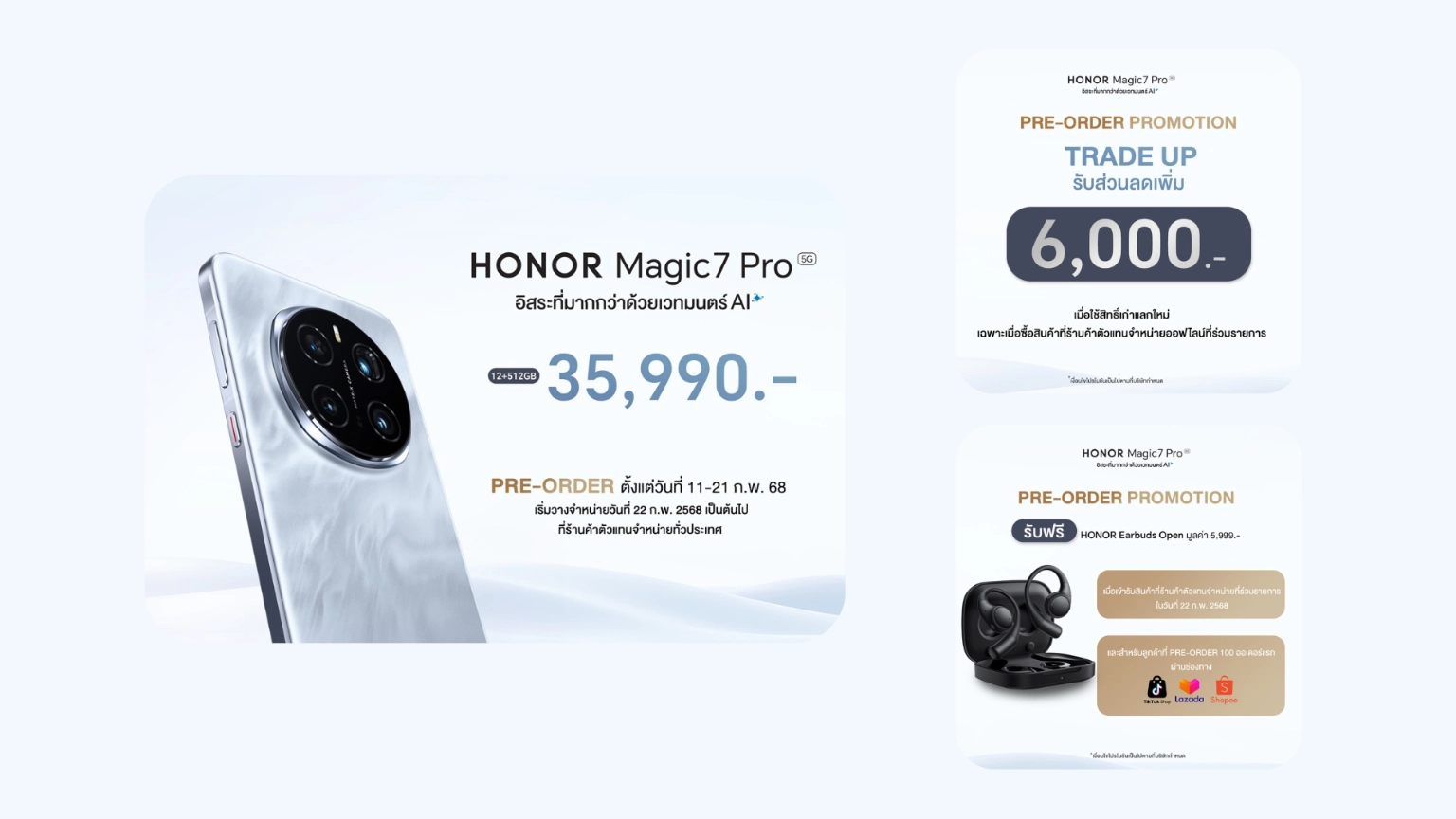 เปิดพรีออเดอร์ตั้งแต่วันที่ 11 – 21 กุมภาพันธ์ 2568 โดยในช่องทางออฟไลน์ รับสิทธิ์เครื่องเก่าแรกใหม่ พร้อมส่วนลดเพิ่มสูงสุด 6,000 บาท สามารถเข้ารับสินค้า ณ HONOR Experience Store สาขาที่ร่วมรายการในวันที่ 22 กุมภาพันธ์ 2568 รับฟรี HONOR Earbuds Open มูลค่า 5,990 บาท