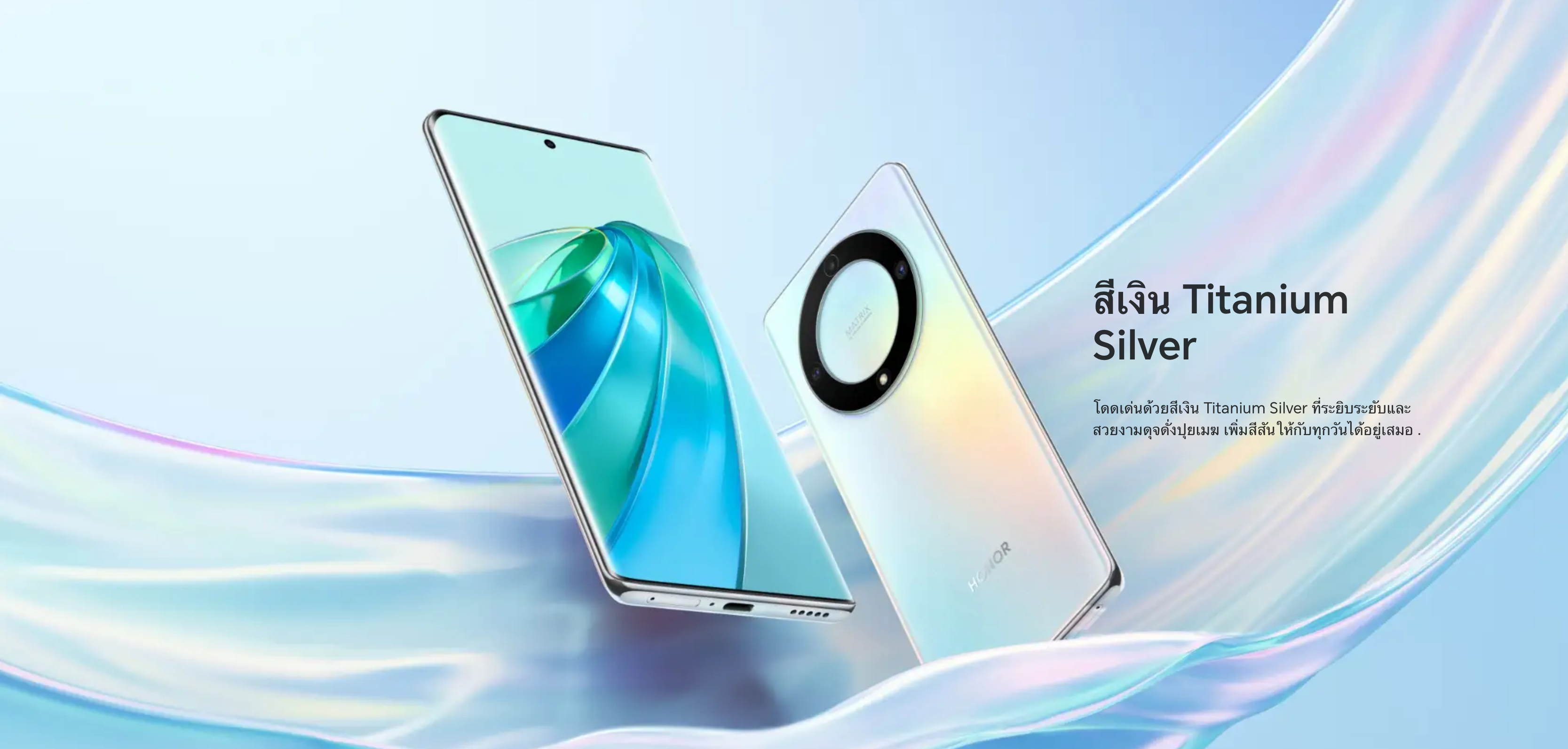 HONOR X9a มีให้เลือกทั้งหมด 2 สี ได้แก่ สีเขียว Emerald Green และ สีเงิน Titanium Silver
