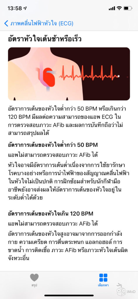 ถ้าหากอัตราการเต้นของหัวใจต่ำกว่า 50 BPM หรืออัตราการเต้นของหัวใจสูงกว่า 120 BPM Apple Watch จะไม่สามารถระบุภาวะหัวใจห้องบนสั่นพลิ้ว (AFib) ได้สำหรับ ECG เวอร์ชัน 1