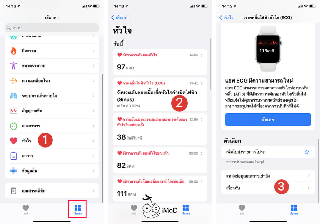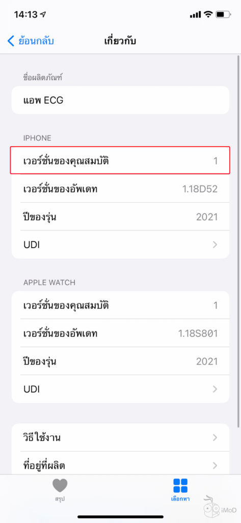 สามารถเช็คเวอร์ชันของ ECG ได้ที่ แอปสุขภาพ (Health) > แถบ เลือกหา (Browse) > หัวใจ (Heart) > เลือกส่วนของ ECG > เกี่ยวกับ (About)