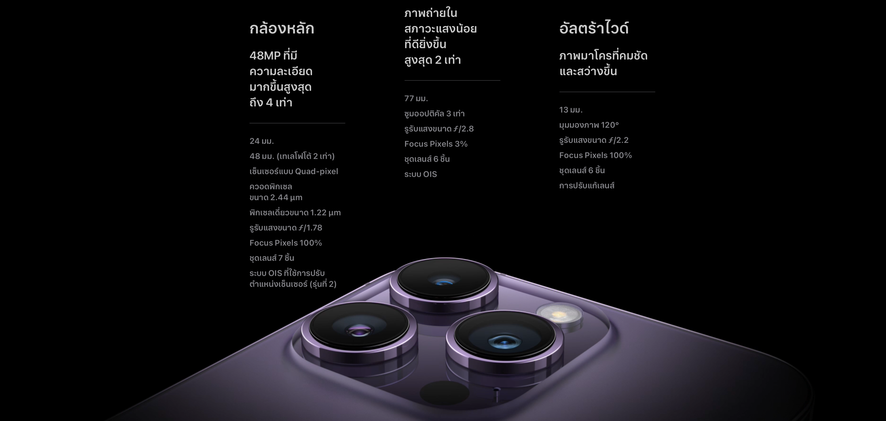 - สำหรับรุ่น Pro กล้องหลัก Apple เขาอัปเกรดมาให้ความละเอียด 48MP เซ็นเซอร์ใหญ่ขึ้น 65% เมื่อเทียบกับ iPhone 13 Pro และสามารถถ่ายภาพในสภาวะแสงน้อยได้ดีขึ้น 3 เท่า บนกล้อง Ultrawide และ ดีขึ้น 2 เท่า บนกล้องหลัก และ กล้อง Tele Photo