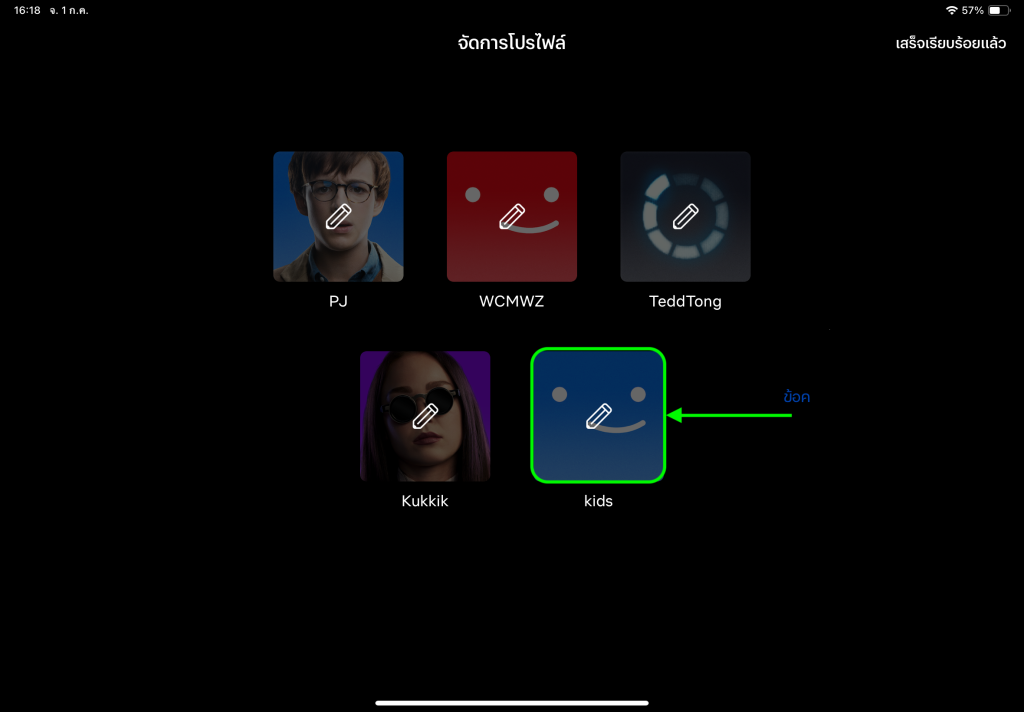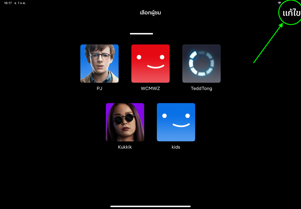 ขั้นตอนที่ 1 เปิดแอป Netflix > ไปที่หน้า “เลือกผู้ชม” > แตะที่ “แก้ไข” มุมขวาบนตามภาพ