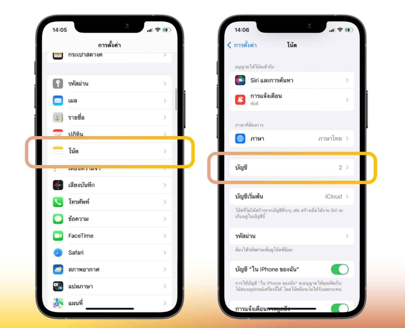 การตั้งค่า > โน้ต > บัญชี