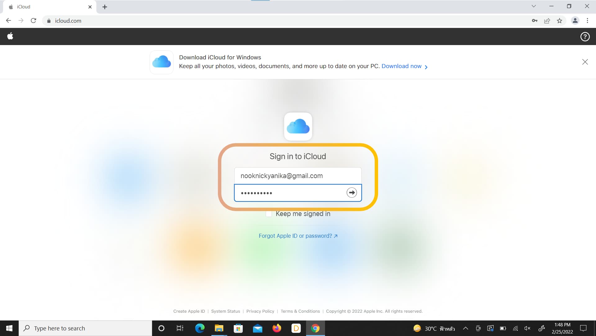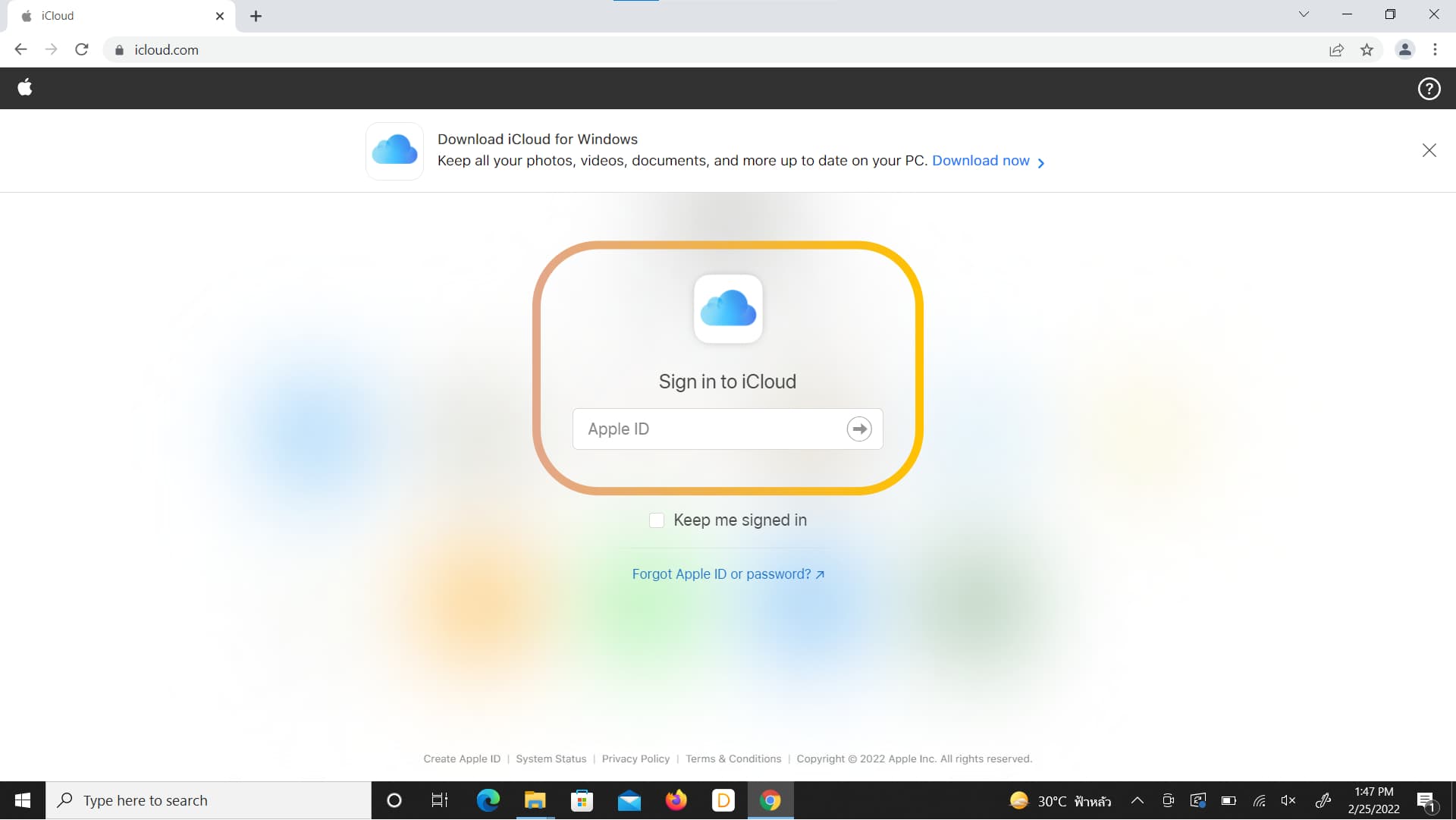 กรอก Apple ID และรหัสผ่านเพื่อทำการล็อคอินเข้าสู่หน้าการตั้งค่า iCloud