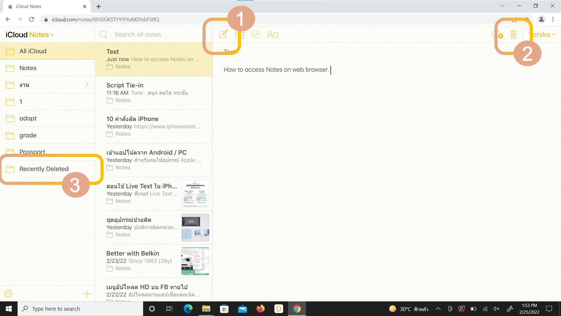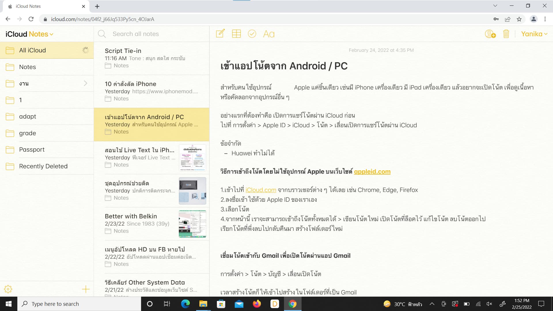 เมื่อเราเปิดการแชร์แอปโน้ตบน iCloud ไว้แล้ว เราก็สามารถเข้าถึงโน้ตต่าง ๆ ในแอปโน้ต โดยที่ไม่ต้องเข้าแอปโน้ตบนอุปกรณ์ Apple ได้แล้ว