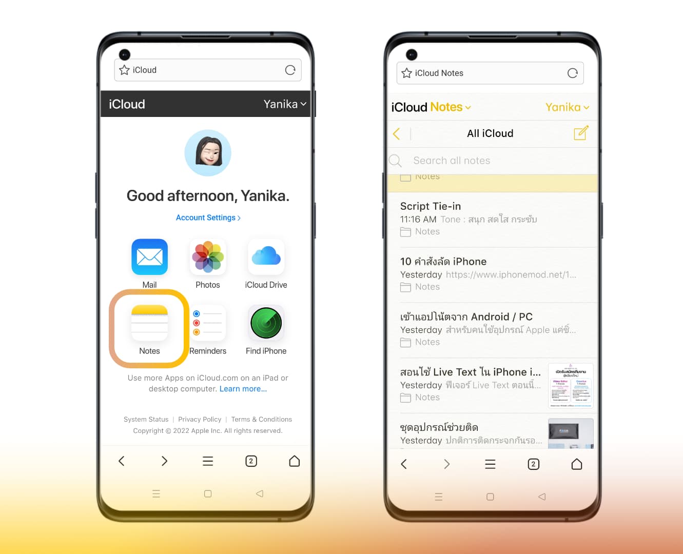 - เข้าถึงโน้ตจากบราวเซอร์ในสมาร์ตโฟน ผ่านเว็บไซต์ www.icloud.com