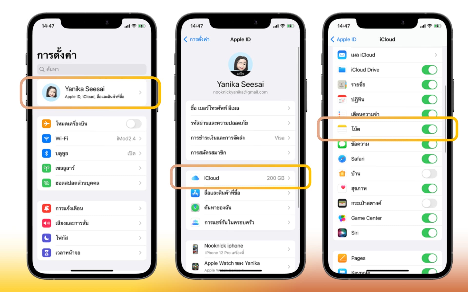 เข้าไปที่ การคั้งค่า > Apple ID > iCloud > เลื่อนเปิดการแชร์แอปโน้ต
