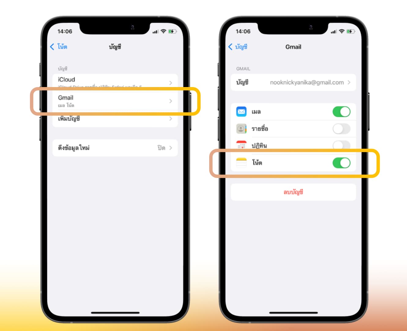 เลือกบัญชีอีเมลที่เราจะทำการแชร์โน้ต โดยอาจจะเป็นอีเมลที่เราใช้ประจำ > เลื่อนเปิดการแชร์โน้ตผ่านอีเมล