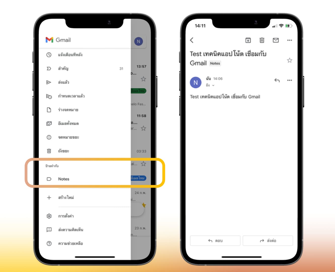 หากเราเชื่อมไว้กับ Gmail เมื่อลองเข้าไปดูที่แอป Gmail บนอุปกรณ์ของเรา ตรงส่วนป้ายกำกับจะมีแถบ “Notes” ปรากฏขึ้นมา จากนั้นก็จะสามารถเข้าถึงโน้ต แล้วทำการแชร์ข้อมูลที่อยู่โน้ตผ่านอีเมลได้ง่าย ๆ