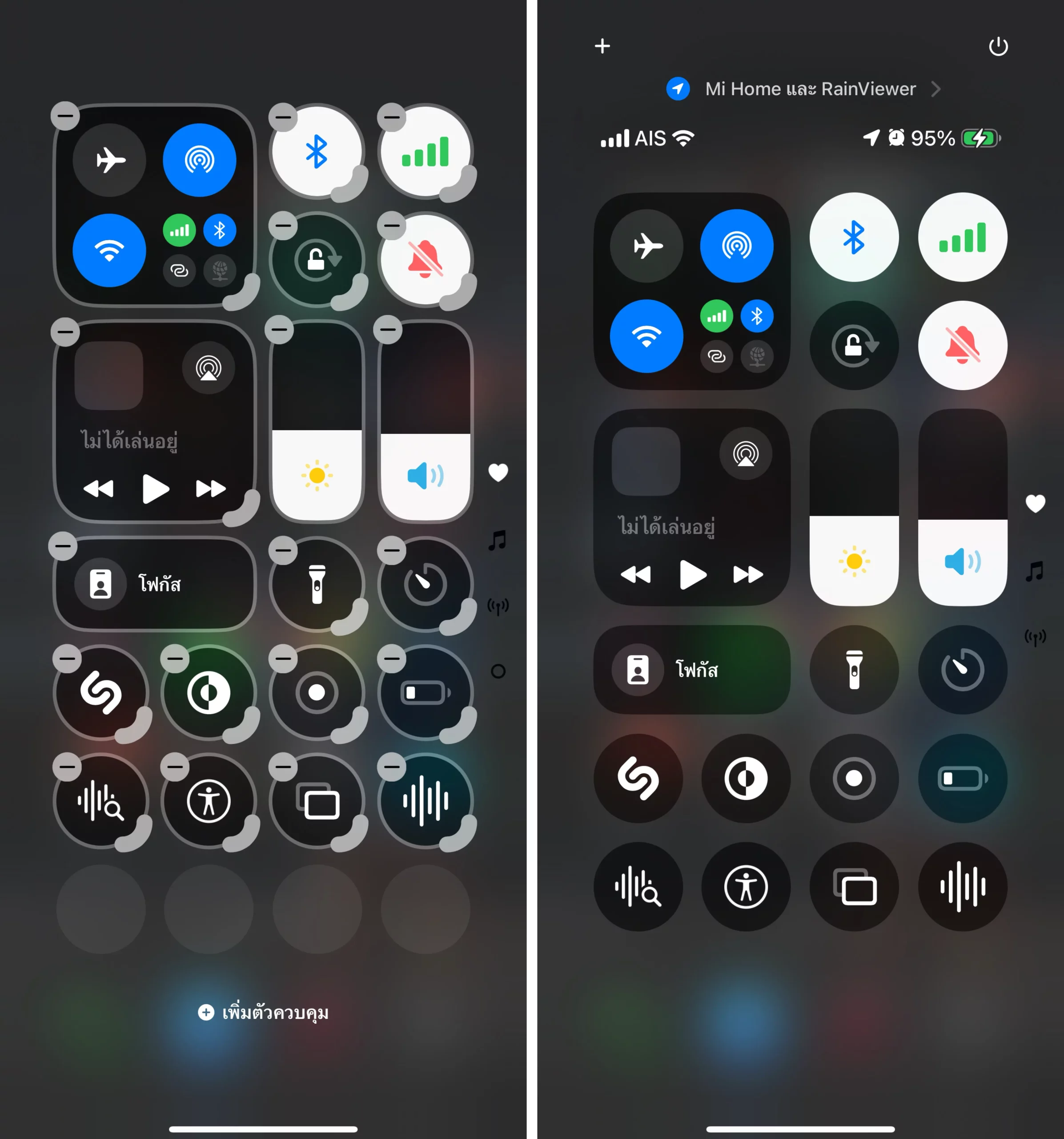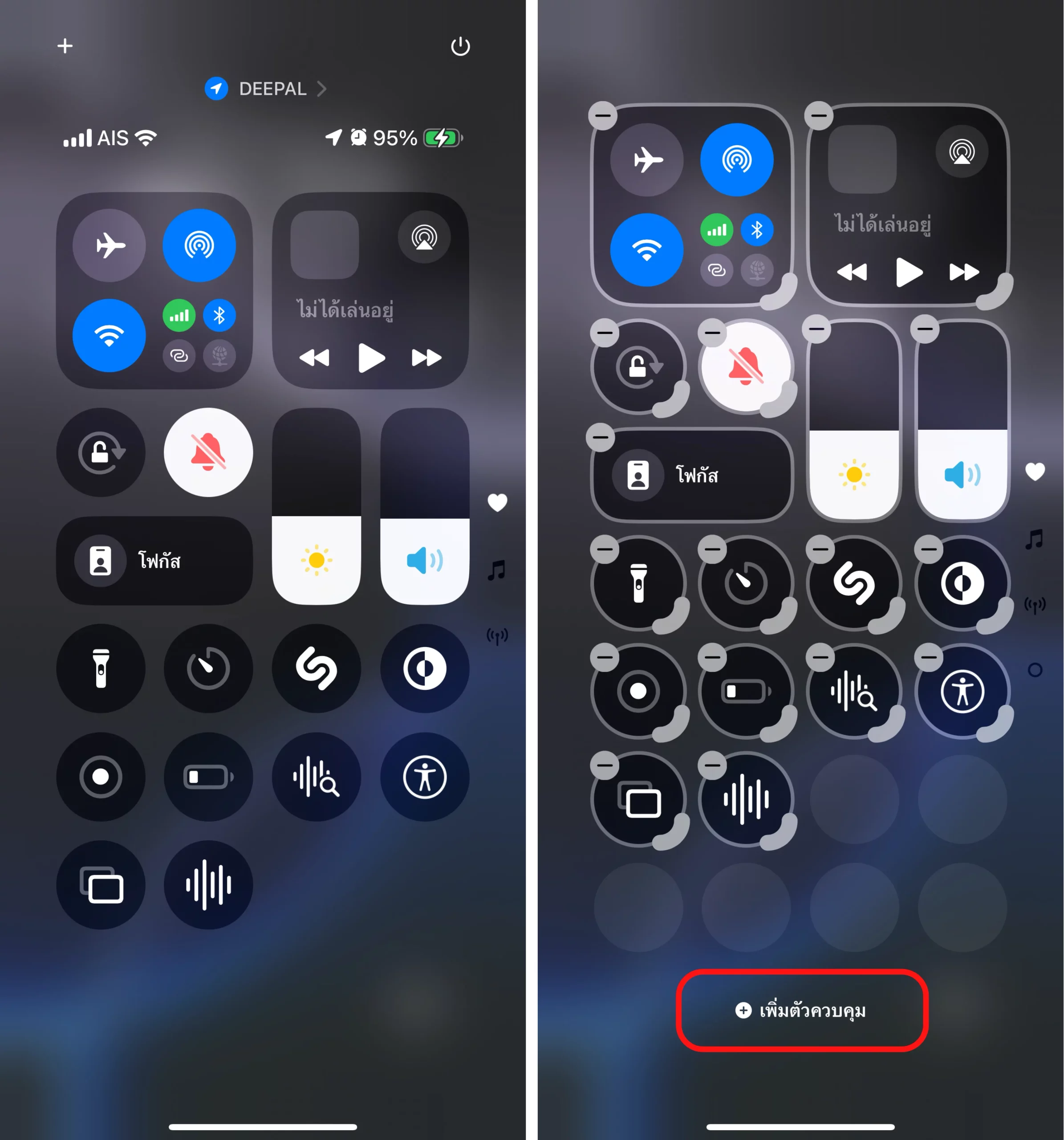 ปัดเรียก Control Center > แตะที่หน้าจอค้างไว้ > แตะ “เพิ่มตัวควบคุม”