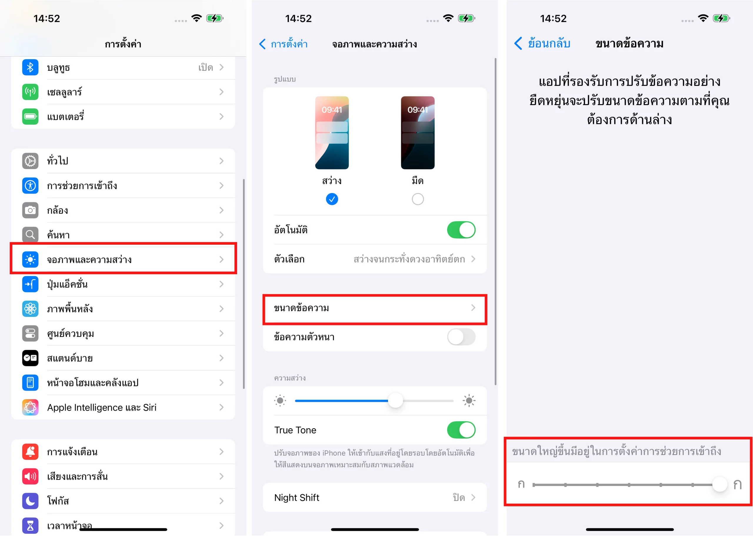 ไปที่แอปการตั้งค่า > การช่วยการเข้าถึง > หน้าจอและขนาดข้อความ