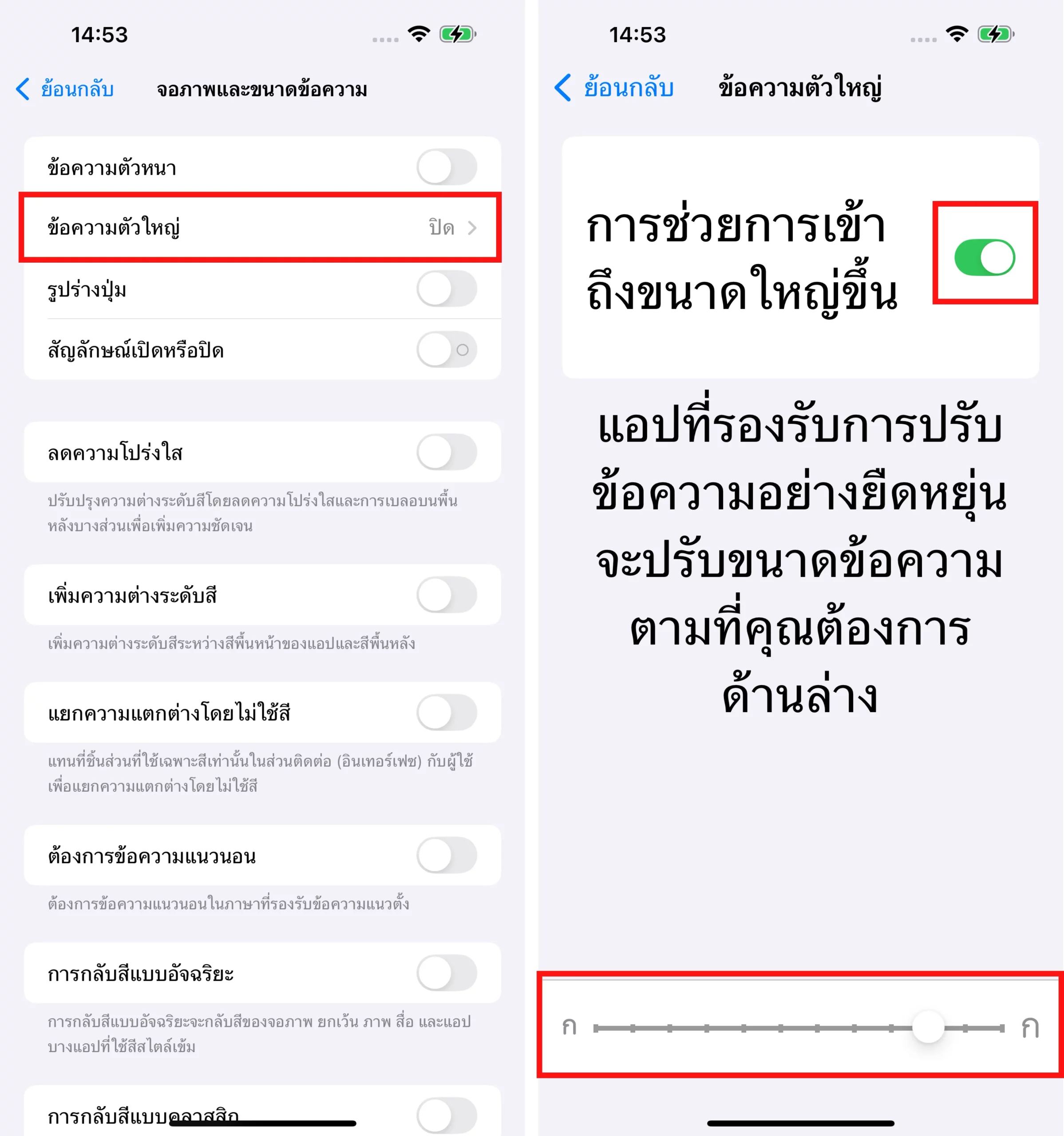 ข้อความตัวใหญ่ > เลื่อนเปิด การช่วยการเข้าถึงขนาดใหญ่ขึ้น > เลื่อนปรับขนาดตามต้องการ