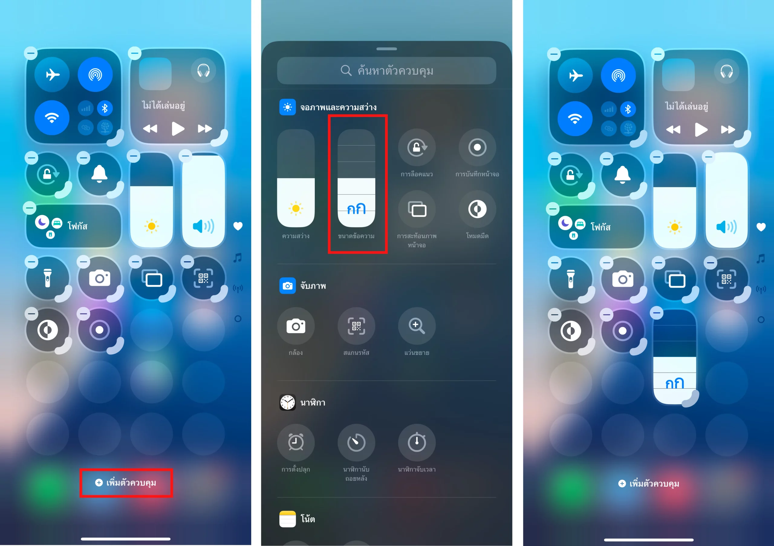 ปัดเรียก Control Center > แตะพื้นที่บนหน้าจอค้างไว้ > แตะไอคอน + > ค้นหาส่วนควบคุมชื่อว่า “ขนาดข้อความ” > ลากไว้ที่ Control Center หน้าแรก