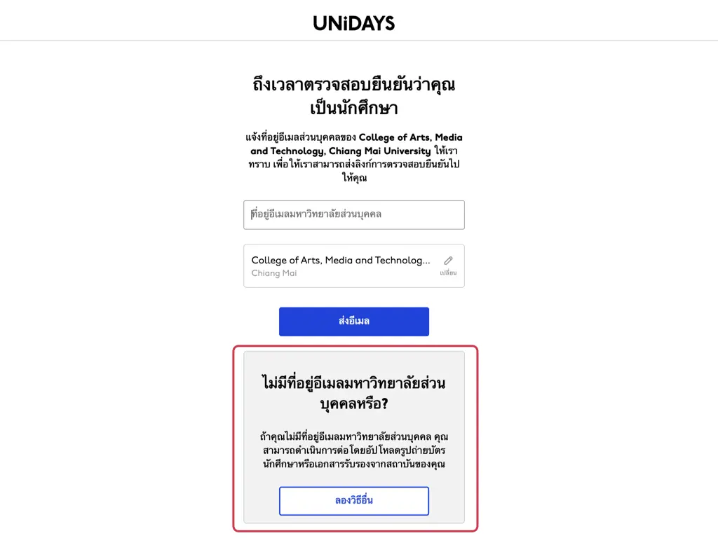 ขั้นตอนที่ 7 หากยังไม่มีอีเมลของมหาวิทยาลัยให้เลือก ไม่มีที่อยู่อีเมลมหาวิทยาลัยส่วนบุคคลหรือ? และกด ลองวิธีอื่น