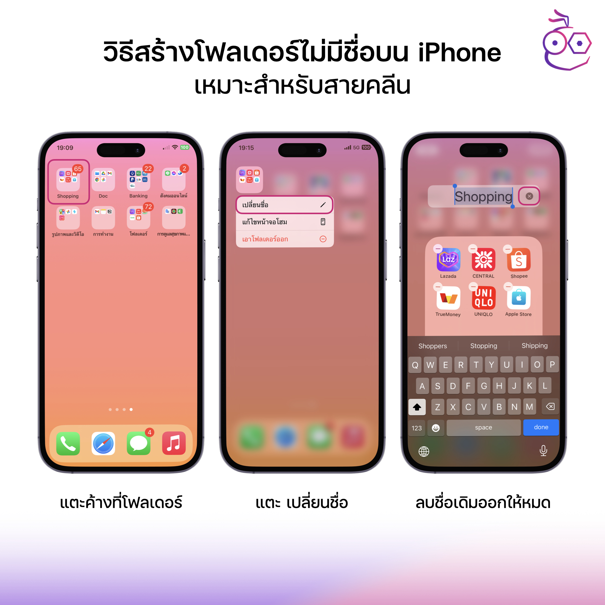 เราก็จะได้โฟลเดอร์ที่ไม่มีชื่อหรือชื่อเป็นแบบว่าง ๆ ให้ทำกับทุก ๆ โฟลเดอร์ เมื่อทำเสร็จแล้ว หน้าจอโฮมของเราก็จะไม่มีข้อความที่บอกชื่อโฟลเดอร์ ก็ดูเรียบง่าย สบายตามากขึ้น บน iPad ก็สามารถทำได้ด้วยวิธีเดียวกัน!