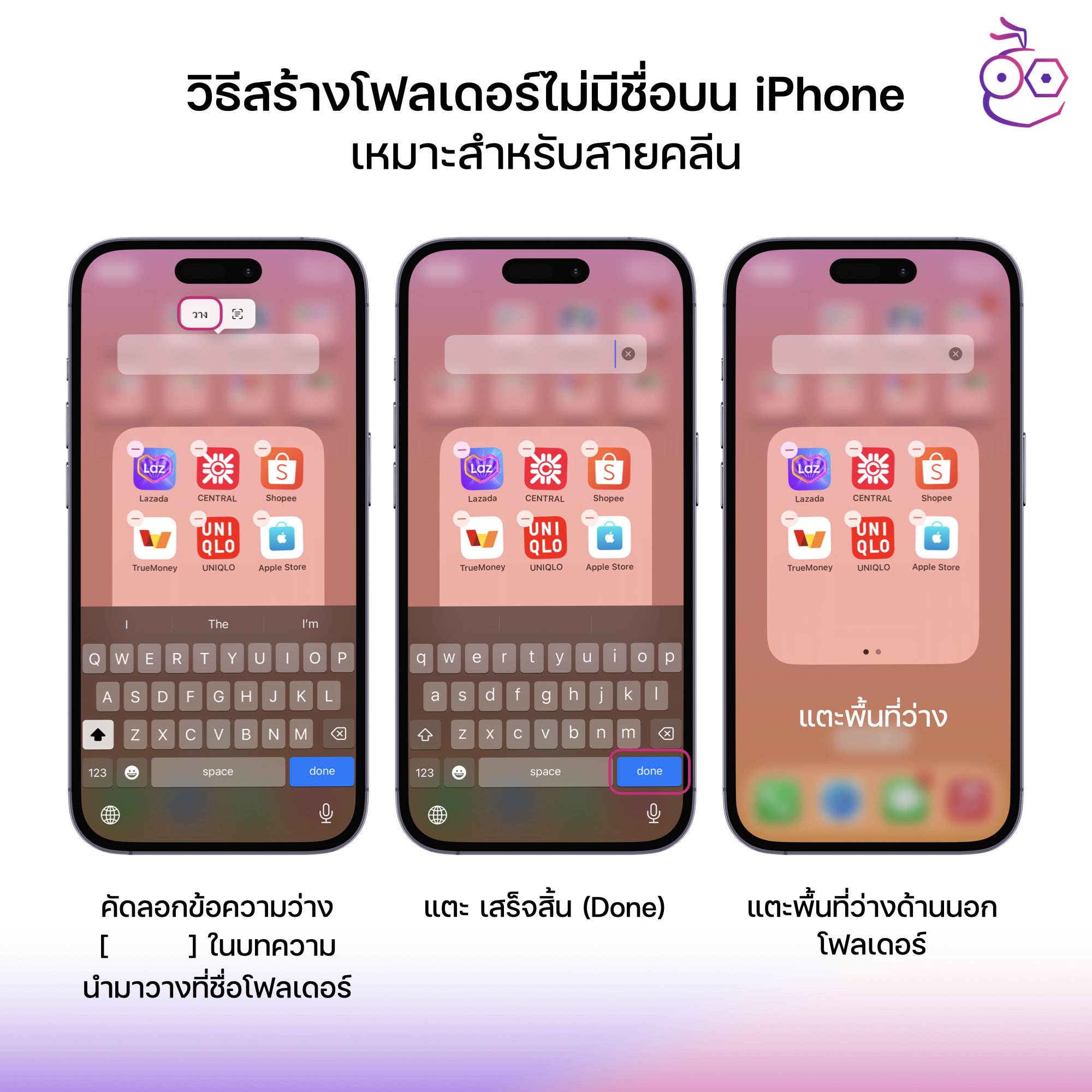 คัดลอกข้อความว่าง ๆ ในวงเล็บ [⠀⠀⠀⠀⠀⠀⠀⠀⠀] (ไม่ต้องคัดลอกเครื่องหมาย [] ไป) แล้วนำไปวางในชื่อโฟลเดอร์ > แตะเสร็จสิ้น (Done) > แตะพื้นที่ว่าง ๆ เพื่อออกไปยังหน้าโฮม