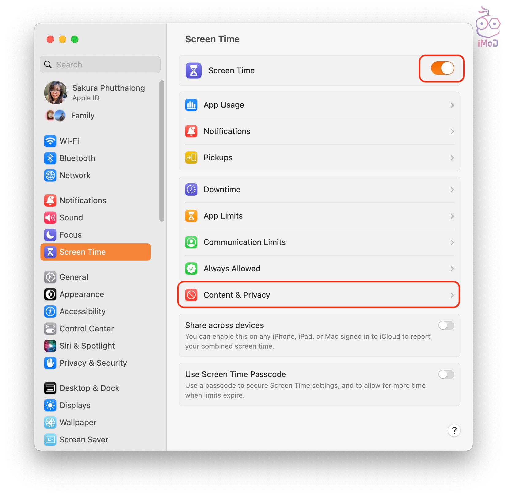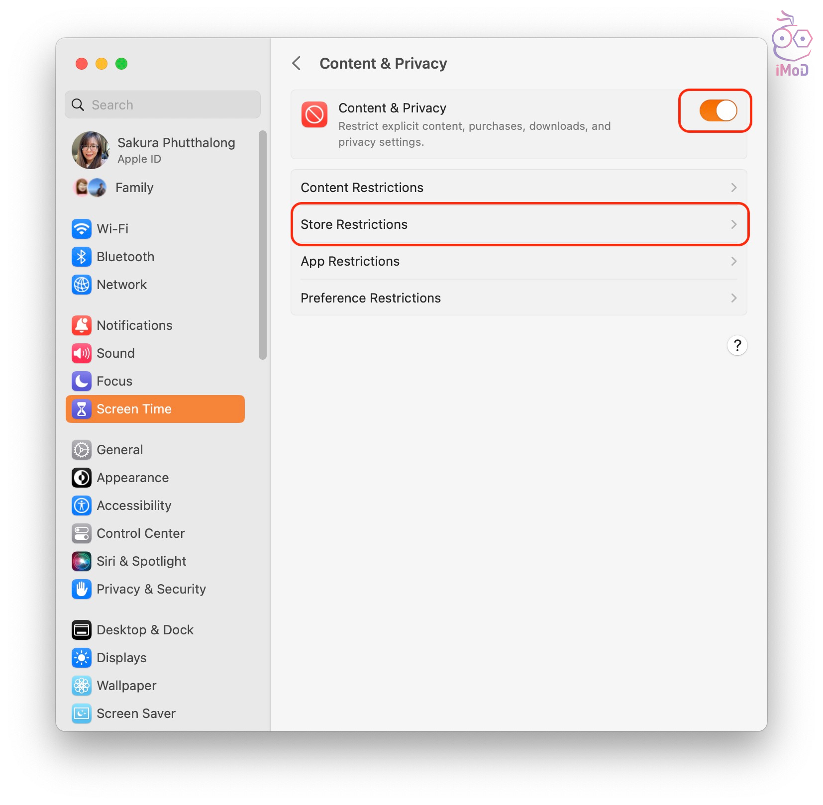 ไปที่ System Preference > Screen Time > คลิกเลือก Content & Privacy