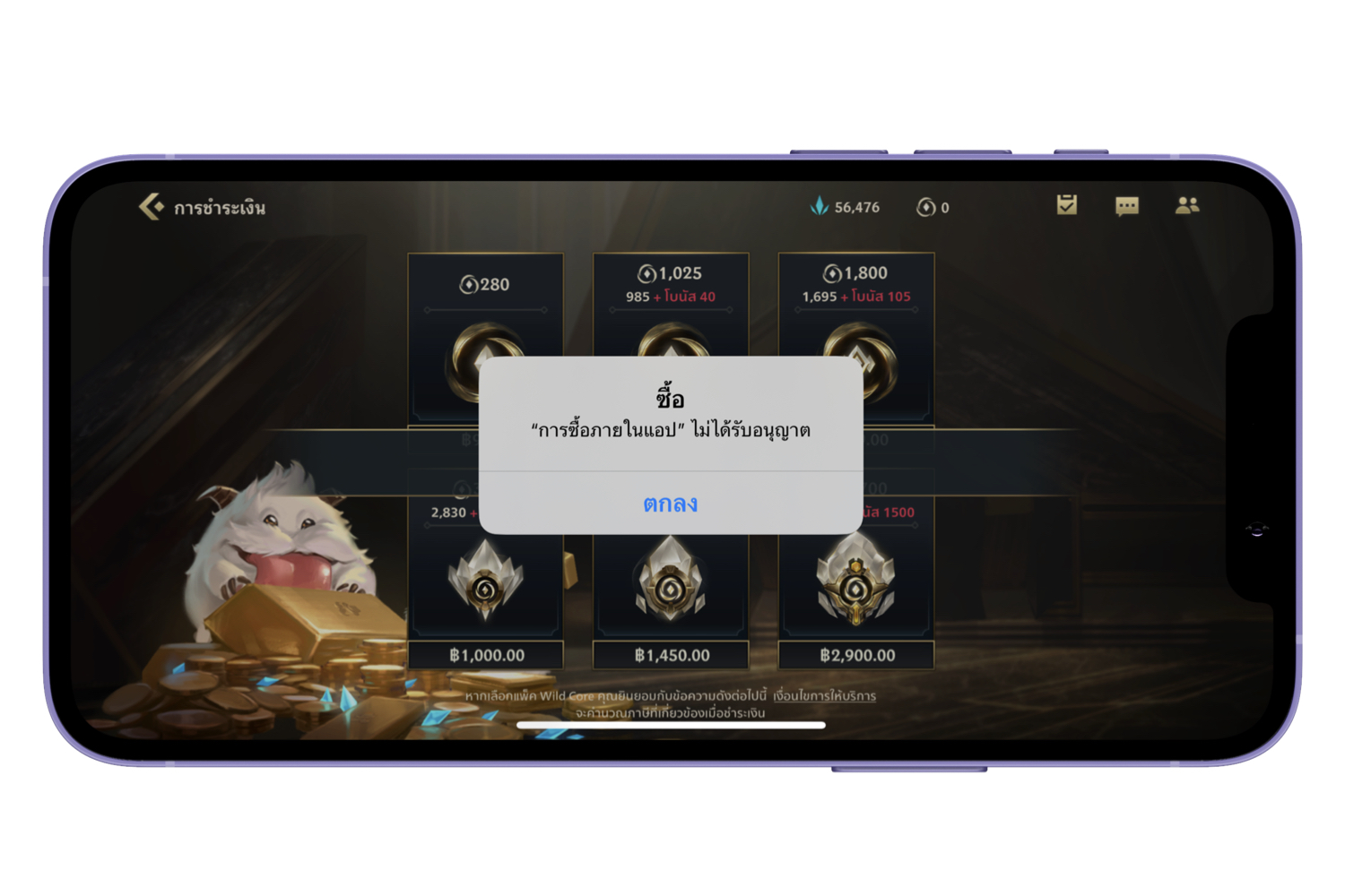 หลังจากตั้งค่าแล้ว เวลาที่มีการกดซื้อภายในแอป ก็จะมีการแจ้งเตือนขึ้นมาว่า ไม่ได้รับอนุญาต