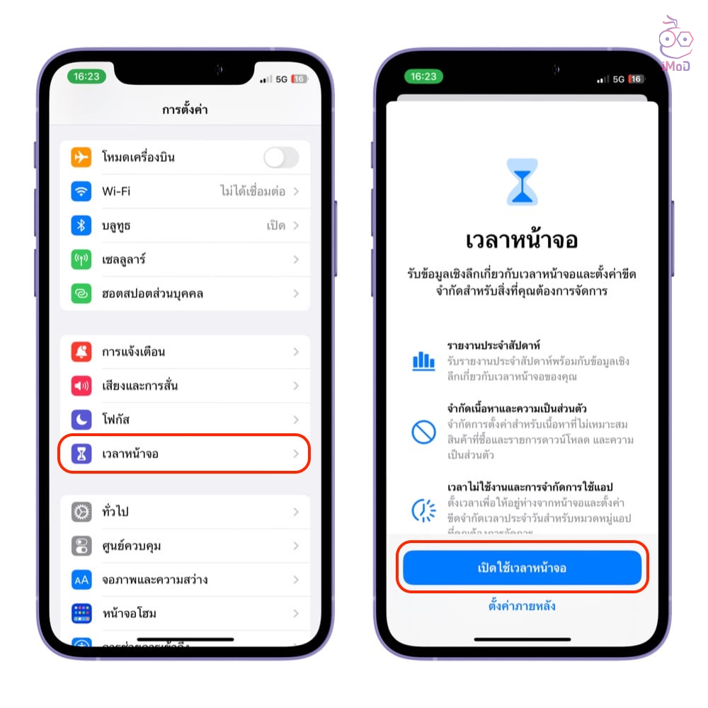 ไปที่ การตั้งค่า (Settings) > เวลาหน้าจอ (Screen Time) > เปิดใช้งานเวลาหน้าจอ (Screen Time)