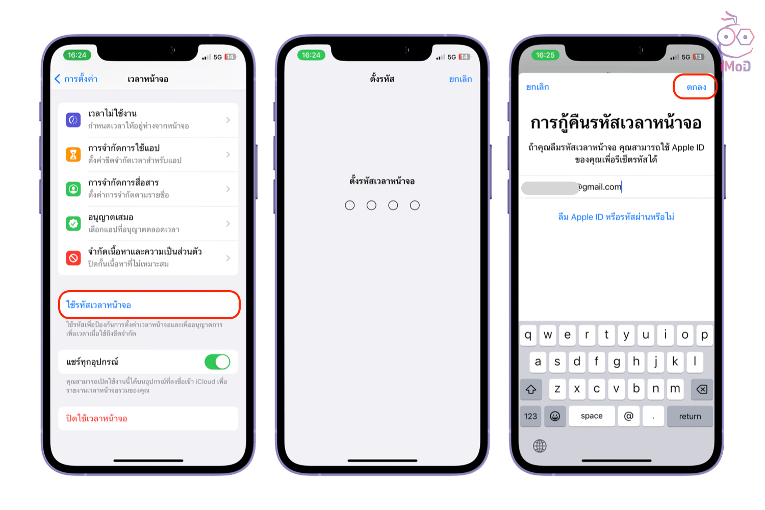 ไปที่ เวลาหน้าจอ (Screen Time) > ใช้รหัสเวลาหน้าจอ > ตั้งค่ารหัสผ่านและยืนยันรหัสผ่าน 4 หลัก > กรอกอีเมล Apple ID แล้วแตะ ตกลง