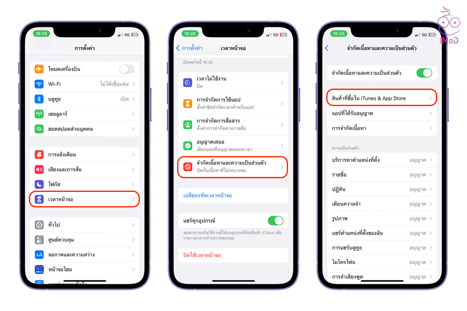 ไปที่ การตั้งค่า (Settings) > เวลาหน้าจอ (Screen Time) > จำกัดเนื้อหาและความเป็นส่วนตัว (Content & Privacy Restrictions) > สินค้าที่ซื้อใน iTunes & App Store (iTunes & App Store Purchase)