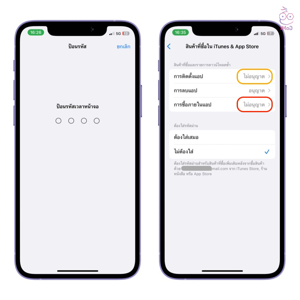 กรอกรหัสผ่านเวลาหน้าจอ 4 หลัก > ตั้งค่าให้ การซื้อภายในแอป (In-app Purchases) เป็น “ไม่อนุญาต” (ถ้าหากต้องการจำกัดการโหลดหรือติดตั้งแอป หรือซื้อแอป ก็สามารถตั้งค่าการติดตั้งแอป (Installing Apps) เป็น “ไม่อนุญาต” ด้วยก็ได้)