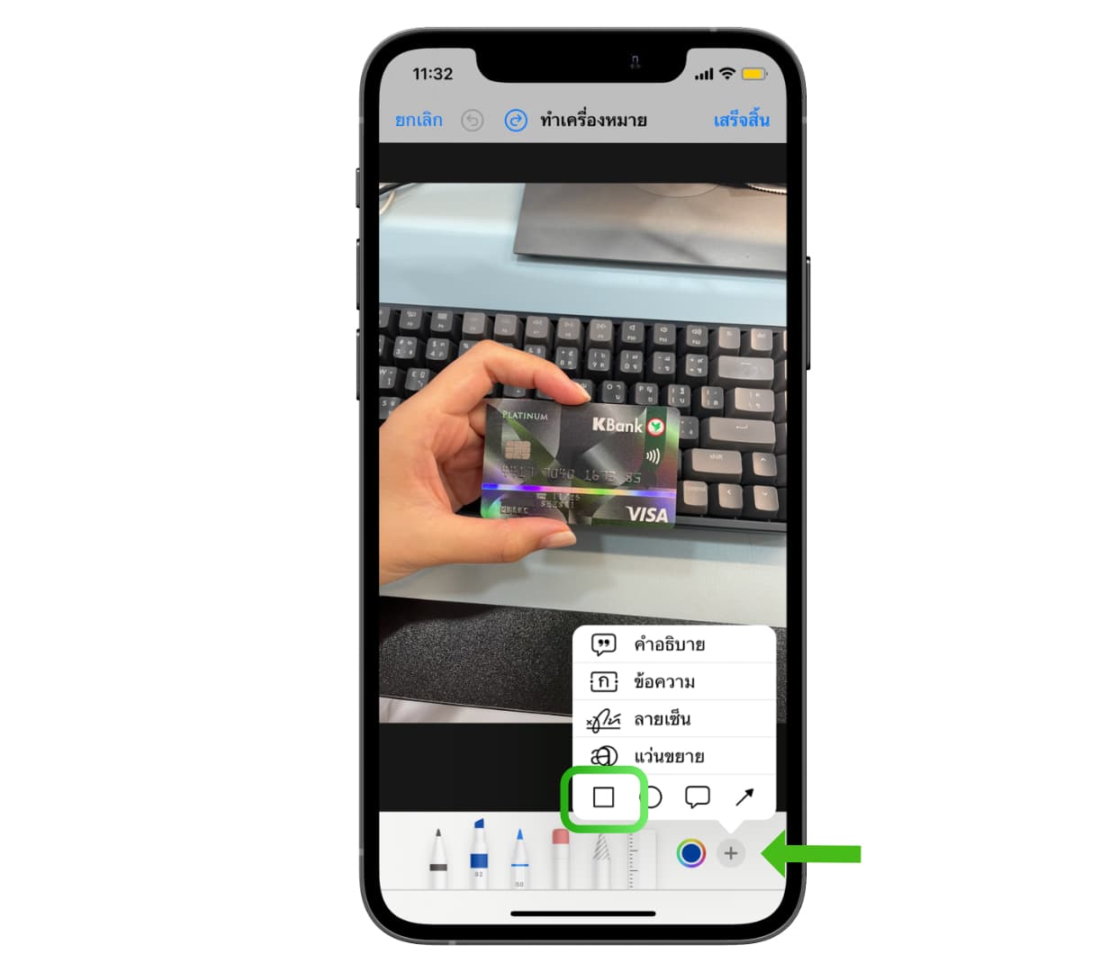 โดยให้เลือกใช้เครื่องมือ  Mark Up เหมือนเดิม จากนั้นแตะที่เครื่องหมาย + จากนั้นเลือกใช้รูปทรงสี่เหลี่ยม