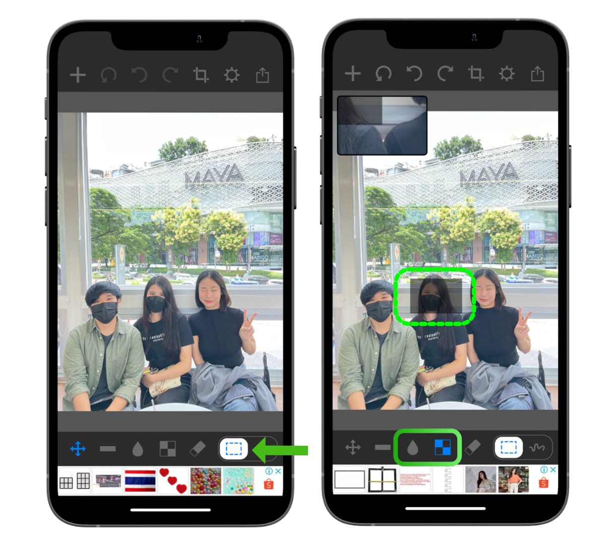 ให้เลือกรูปแบบเครื่องมือเป็นสี่เหลี่ยม แล้วเลือกใช้เครื่องมือเบลอ (รูปหยดน้ำ) หรือเครื่องมือโมเสคก็ได้