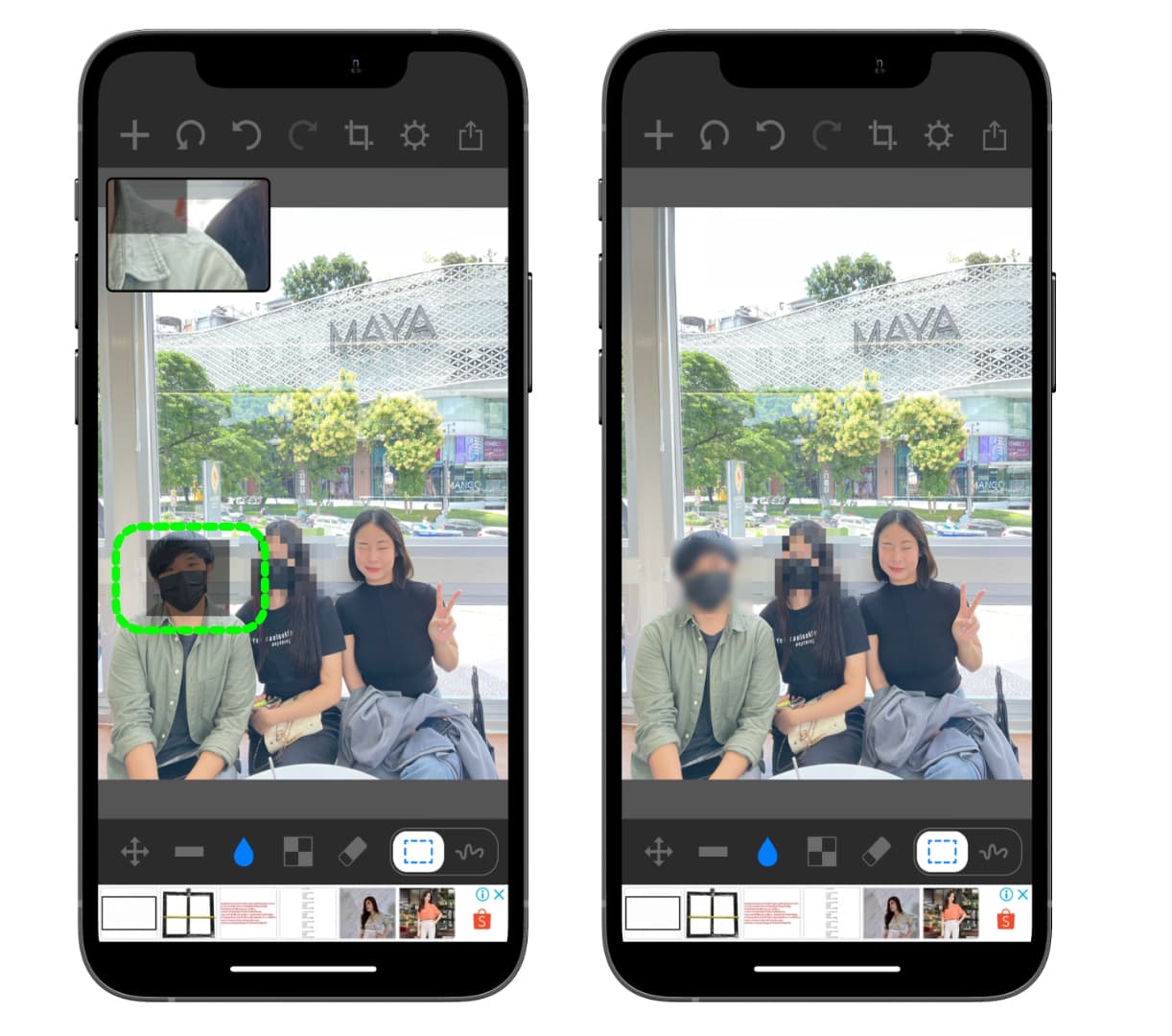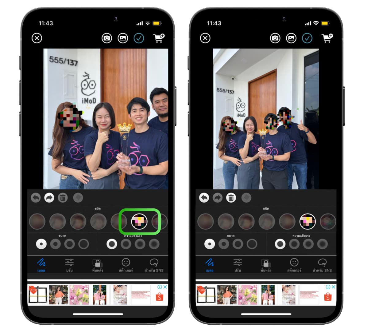 เลือกใช้เครื่องมือโมเสค แล้วก็ใช้นิ้วลากเพื่อเบลอใบหน้าคนในรูปภาพได้เลย