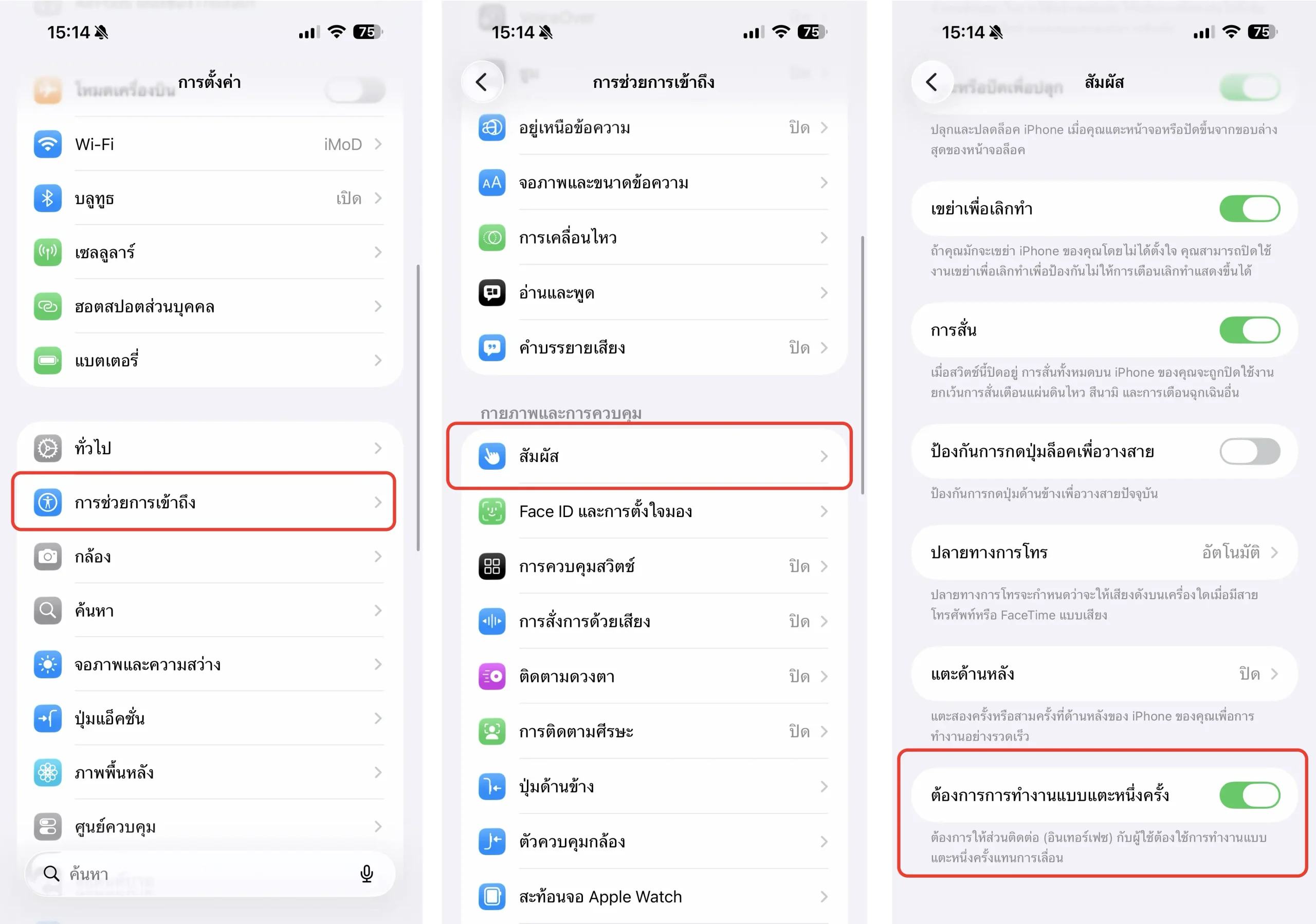 ไปที่ การตั้งค่า (Settings) > การช่วยการเข้าถึง (Accessibility) > สัมผัส (Touch) > เลื่อนเปิด ต้องการการทำงานแบบแตะหนึ่งครั้ง (Prefer Single-Touch Actions)