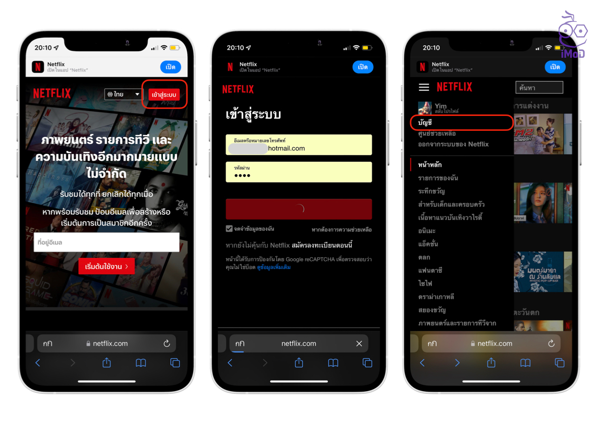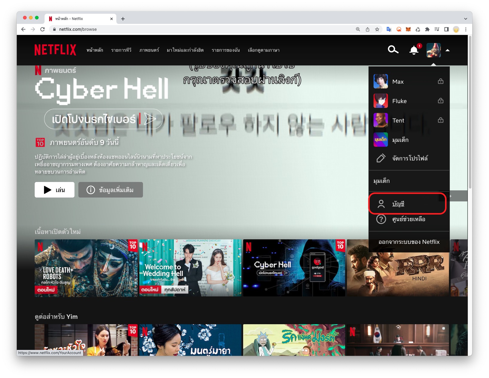 ไปที่เว็บไซต์ netflix.com > เข้าสู่ระบบให้เรียบร้อย > แตะไอคอน 3 ขีดที่มุมบนขวา เลือก บัญชี (Account)