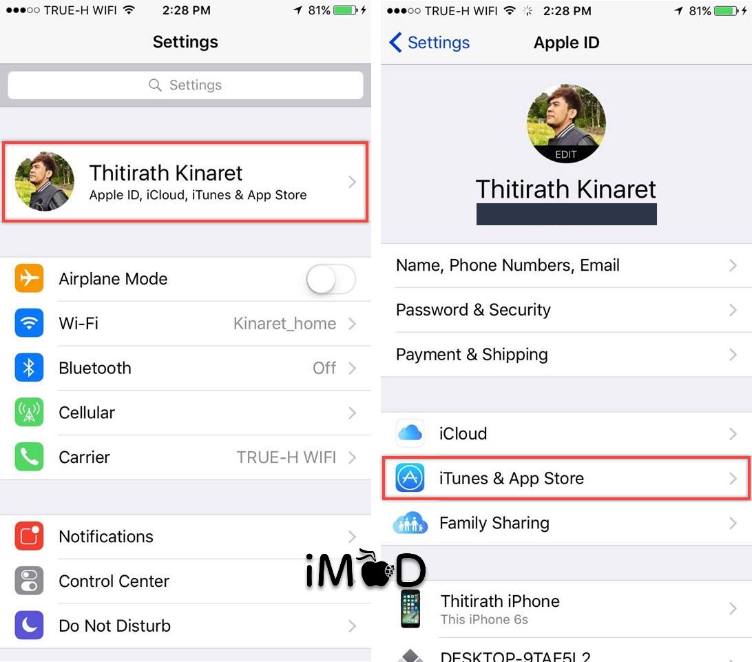 ไปที่ Settings (ตั้งค่า) > แตะที่ Apple ID ด้านบน > iTunes & App Store