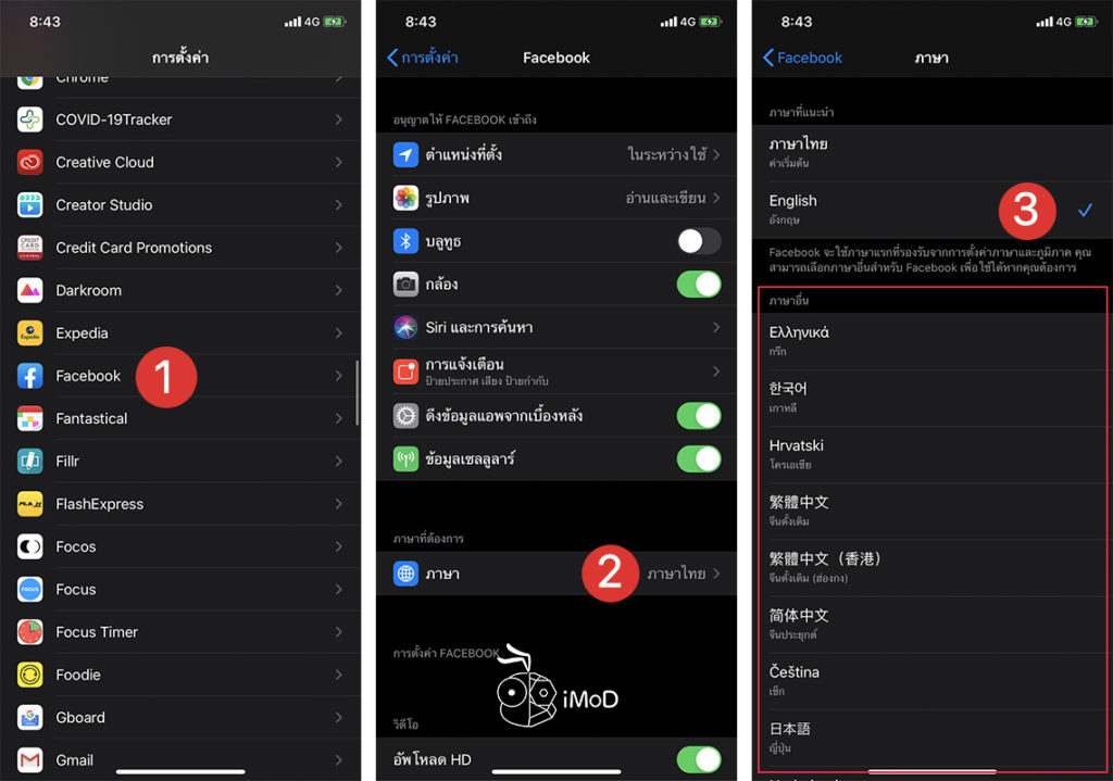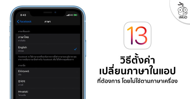 ตัวอย่างเลือกเปลี่ยนภาษาแอป Facebook ให้เป็นภาษาอังกฤษ โดยภาษาเครื่องใช้ยังคงเป็นภาษาไทย ใครที่ใช้งานในเครื่อง iPhone หรือ iPad เป็นภาษาหนึ่ง แล้วอยากจะเปลี่ยนภาษาในแอปอื่น ๆ เป็นอีกภาษาหนึ่ง เช่น Facebook, Twitter, Instagram ก็สามารถตั้งค่าภาษาของแอปเหล่านี้ได้