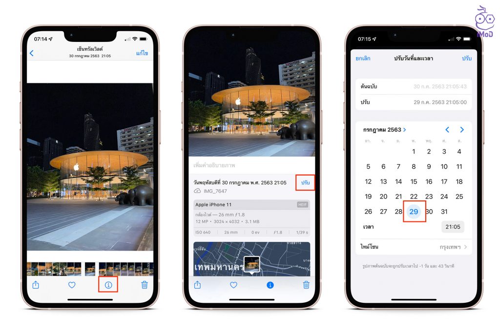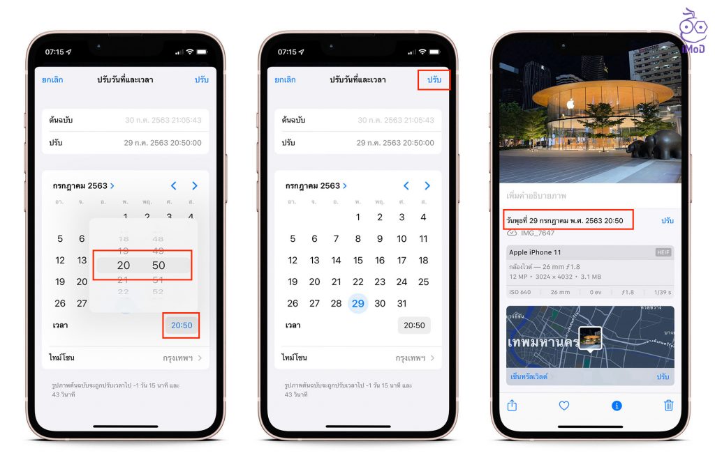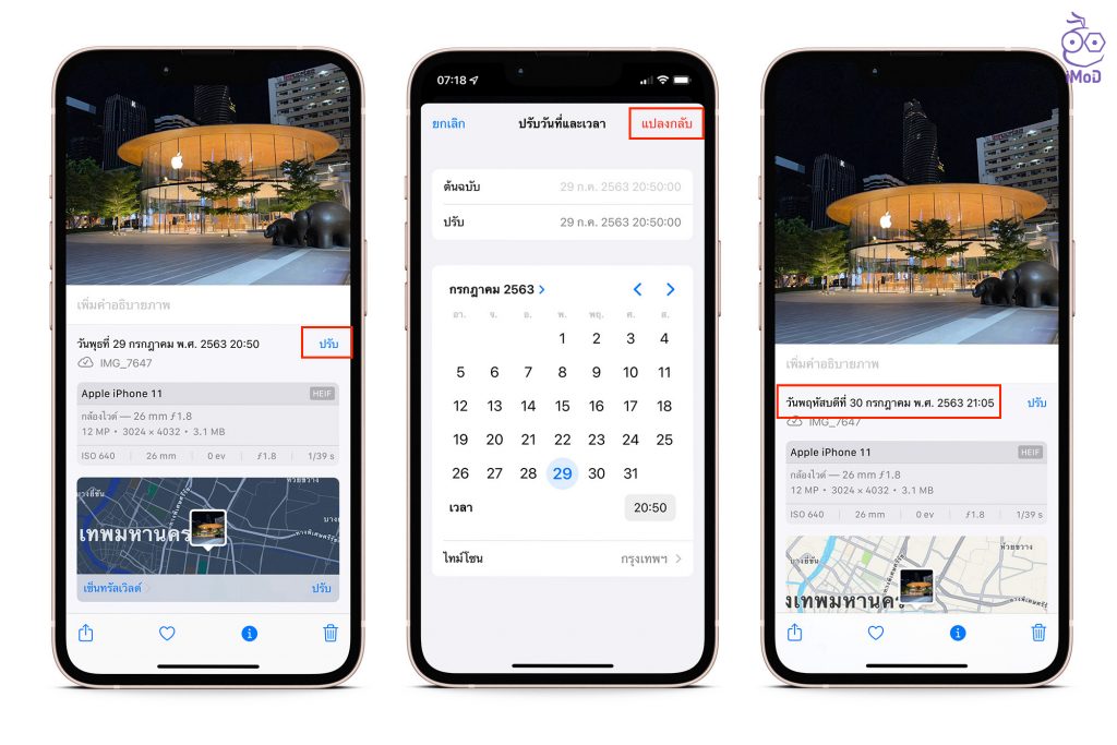 เปลี่ยนเวลา > เมื่อเปลี่ยนเสร็จแล้วให้แตะ ปรับ (Adjust) (นอกจากนี้ เรายังสามารถเปลี่ยนสถานที่ได้ด้วย ตรงด้านล่าง หากพบว่าหมุดที่ปักไม่ตรงกับสถานที่ที่เราถ่ายจริง) > เมื่อเปลี่ยนแปลงเวลาและวันที่แล้ว เราก็จะได้เวลาและวันที่ใหม่