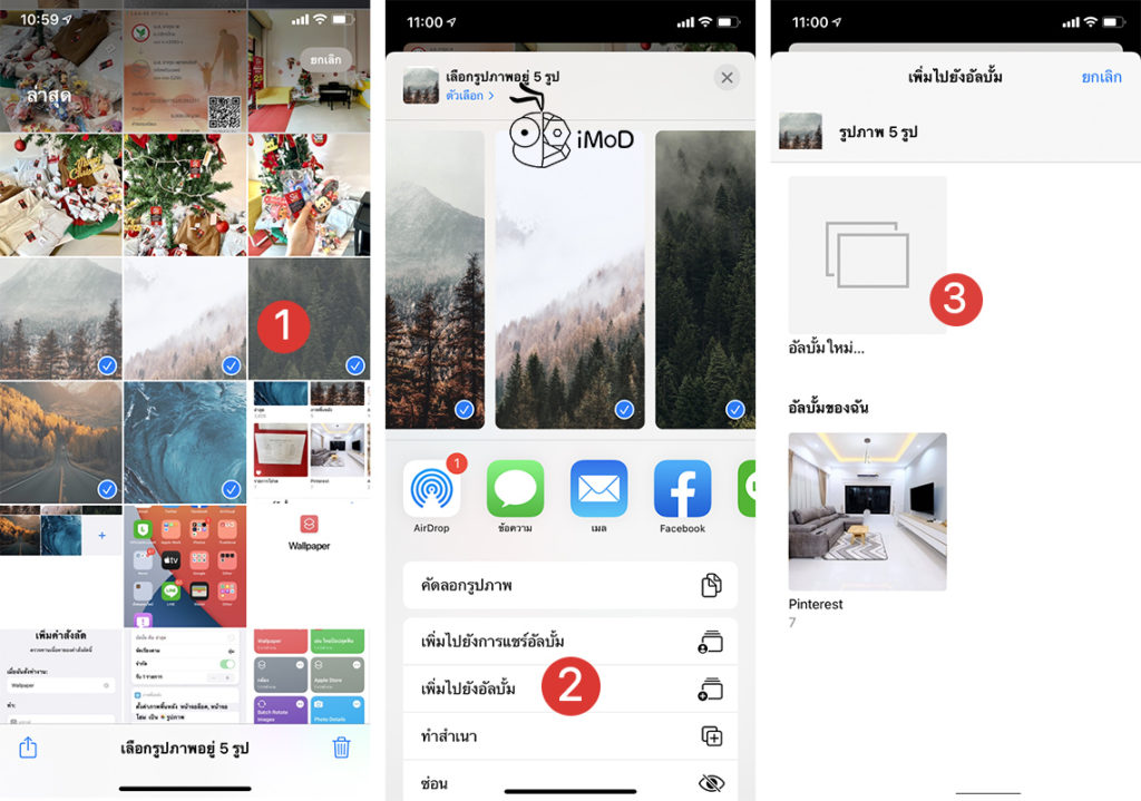 ก่อนอื่นเราจะต้องสร้างอัลบั้ม เพื่อเก็บรวบรวมภาพพื้นหลังก่อน โดยไปที่ แอปรูปภาพ (Photos) > เลือกภาพพื้นหลังที่ต้องการ แล้วแตะไอคอนแชร์ด้านล่างซ้าย > แตะ เพิ่มไปยังอัลบั้ม > แตะ อัลบั้มใหม่