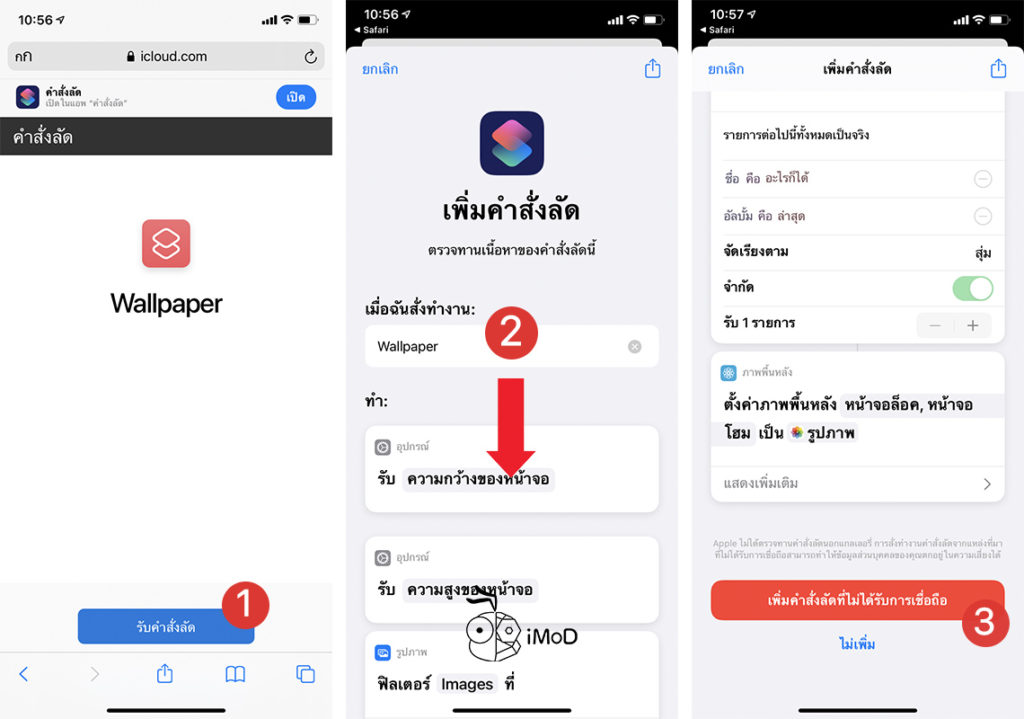 จากนั้นให้เราทำการติดตั้งคำสั่งลัด Wallpaper [แตะรับคำสั่งลัดที่นี่] แนะนำให้เปิดลิงก์ใน Safari > แตะ รับคำสั่งลัด > เลื่อนลงมาด้านล่าง แล้วแตะ เพิ่มคำสั่งลัดที่ไม่ได้รับการเชื่อถือ