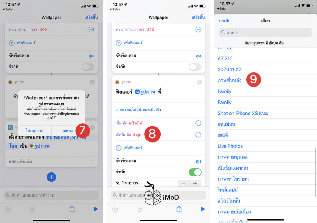 แตะไอคอนคำสั่งลัด Wallpaper > เราจะเห็นหน้าต่างการทำงานของคำสั่งลัดด้านบนสักครู่ จากนั้นภาพพื้นหลังก็จะสุ่มเปลี่ยนไปตามภาพในอัลบั้มที่เราเลือกใช้