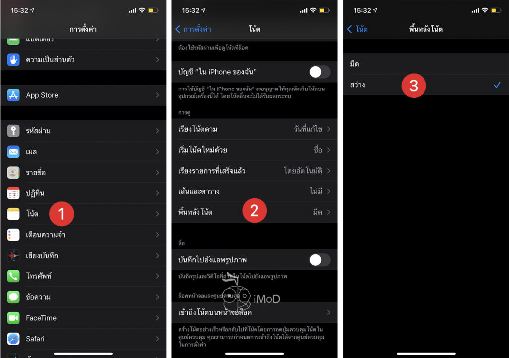 เมื่อเราเปิดโหมดมืดหรือ iPhone กำลังใช้งานโหมดมืดอัตโนมัติตามที่เราตั้งค่าอยู่นั้น เราสามารถเปลี่ยนให้พื้นหลังของแอปโน้ตเป็นสีขาวหรือสีครีมปกติได้ ดังนี้