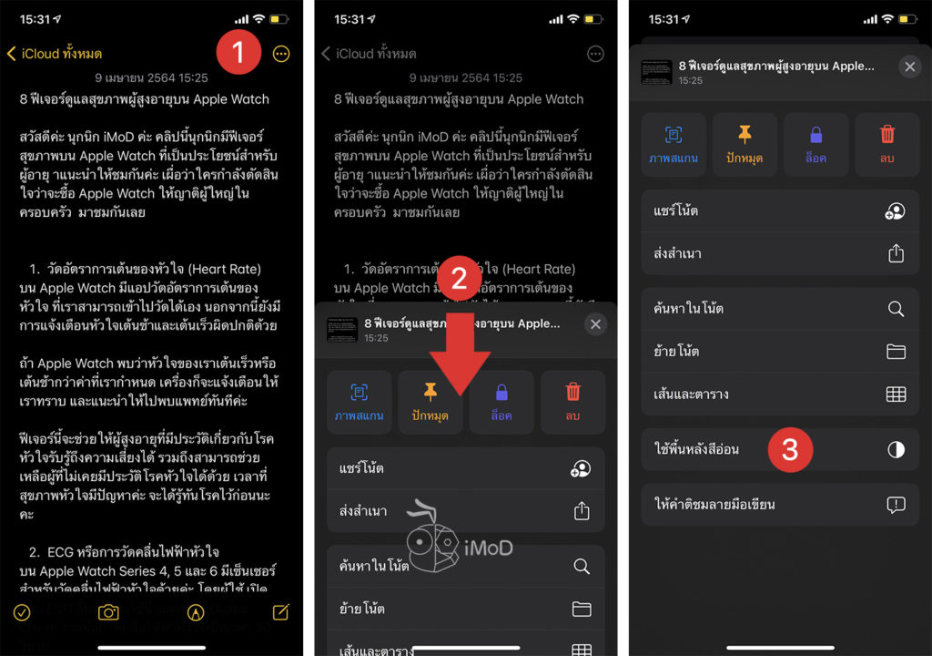 โดยการเข้าไปที่โน้ตที่ต้องการ แล้วแตะไอคอน 3 จุดด้านบน > เลื่อนลงด้านล่าง > แตะ ใช้พื้นหลังสีอ่อน (Use Light Background)